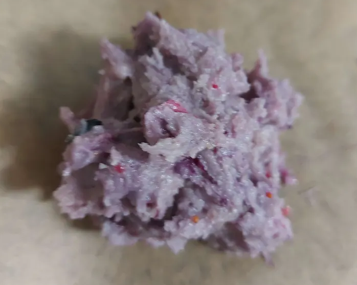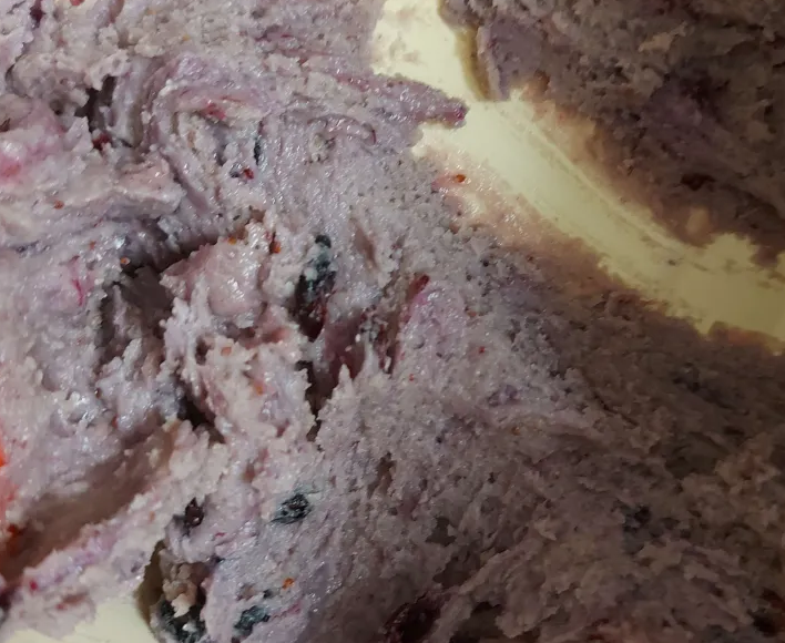 After this, I beat together the butter and sugar until it was light and fluffy using an electric whisk. When this was ready, I added in the jam-like blueberries and combined this in completely, adding in the egg and vanilla essence.