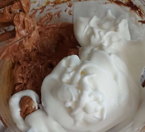 When the chocolate was liquidy again, I added about a third (1/3) of the whisked egg whites into the batter.