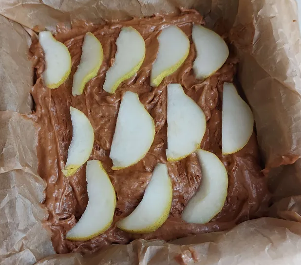 With the remaining batter, I poured it into a separate tin, and cut some slices of pears to decorate the top.