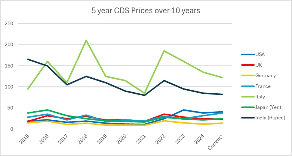 From google gemini, https://gemini.google.com/app/9679972ac86a8ddc , they say, a table showing the approximate 5-year Sovereign CDS spreads (in basis points, where 100 bps = 1%) at the end of each year.
