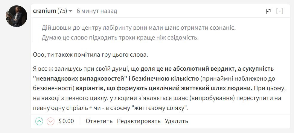 Я не збираюсь осуджувати, критикувати чи ставити під сумнів будь-яку протилежну точку зору, яка не співпадає з моєю. Я просто хочу висловити свою точку зору, сформулювати своє бачення стосовно того, як я сприймаю поняття долі.