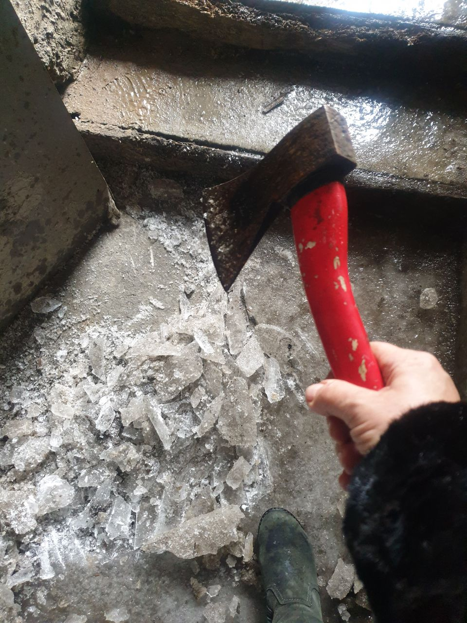 Добре, що в багажнику завжди є сокира. Подовбала я льод, змогли відкрити двері. Повиносила той лід лопатою. Справилась)
