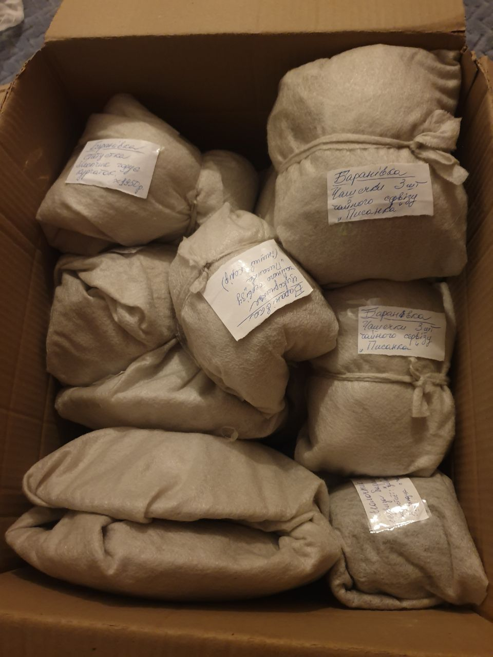 Все просто: на клаптик нетканної тканини, яку виробляє завод, я кладу пупирки пару шарів, потім пришиваю мотузочки. Вкладаю в це виробв, завертаю та зав'язую. Приклеюю назву виробу і мені ясно що в тому згорточку.