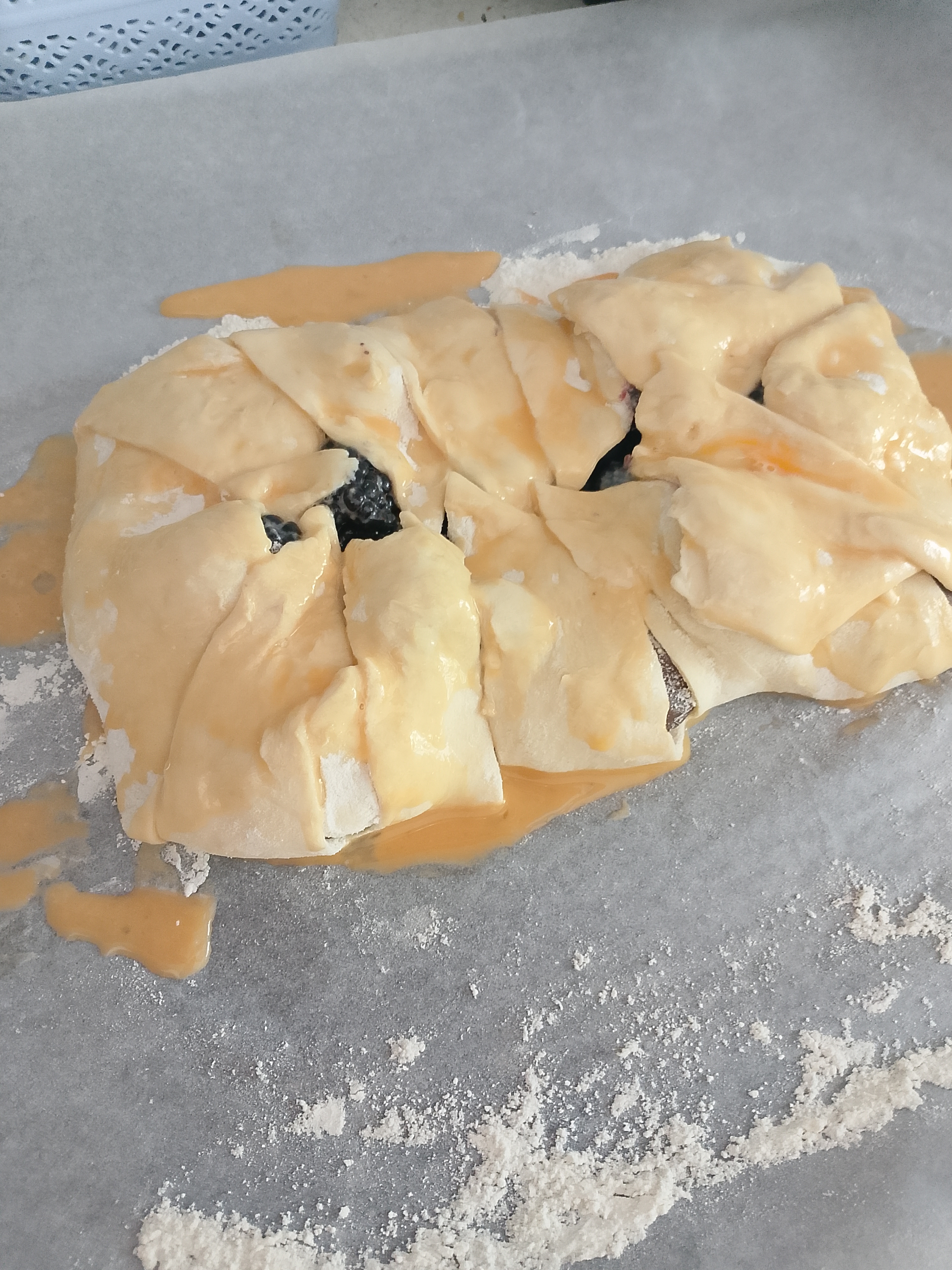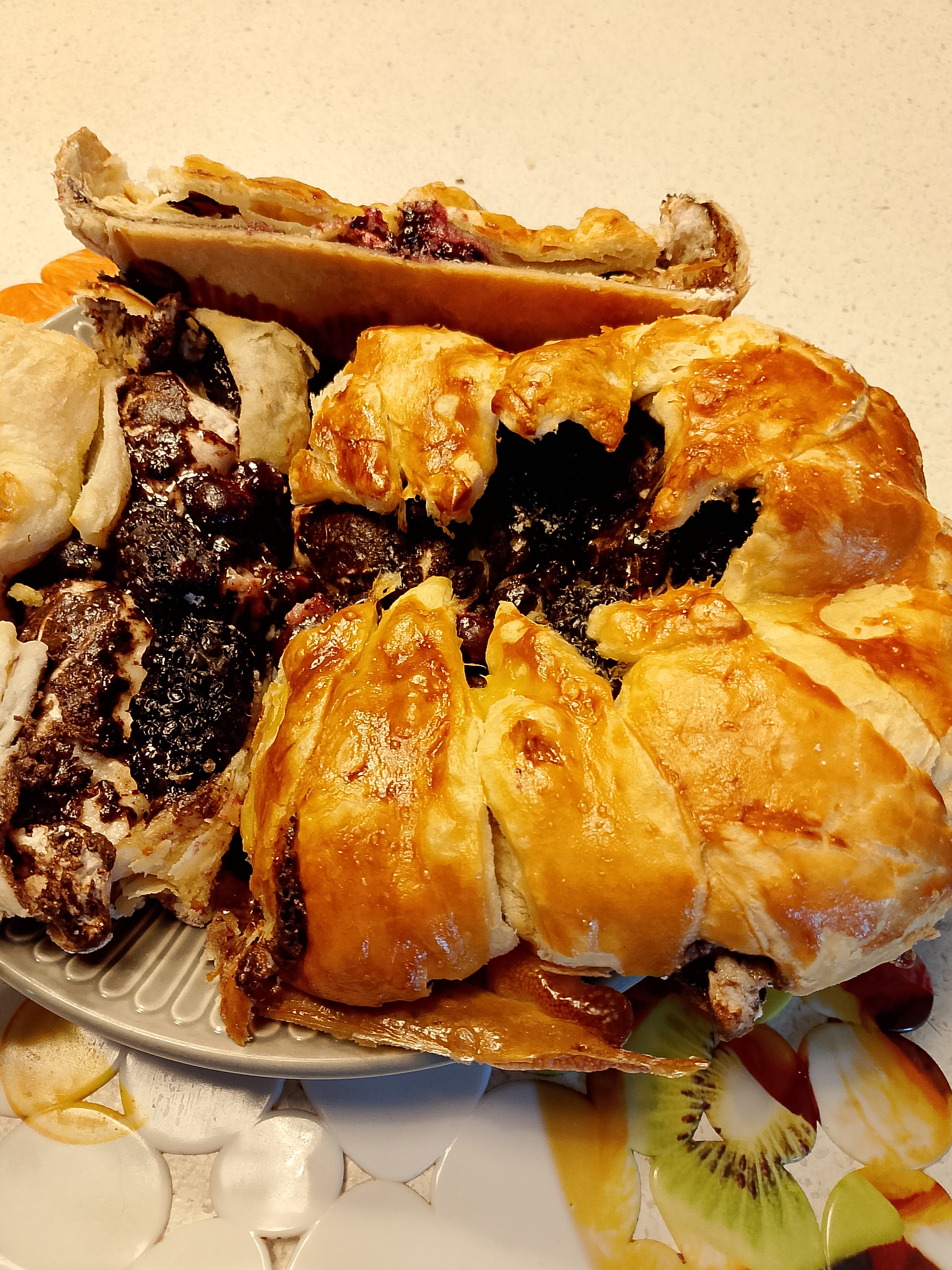 Рецепт дуже легкий. Тісто заморожене з магазину. Краще дріжджове листаове, але і слоєне підійде. Шість штучок зефіру в шоколадній глазурі, трошки придавити дном чашки, розплескати. Тісто розморозити, розкатати і порізати ялинкою від центру до краю. До зефіру додати ягоди, які маєте - у мене ожина і чорна смородина. На пергамент і деко - на 30 хвилин в духову шафу при температурі 200°.