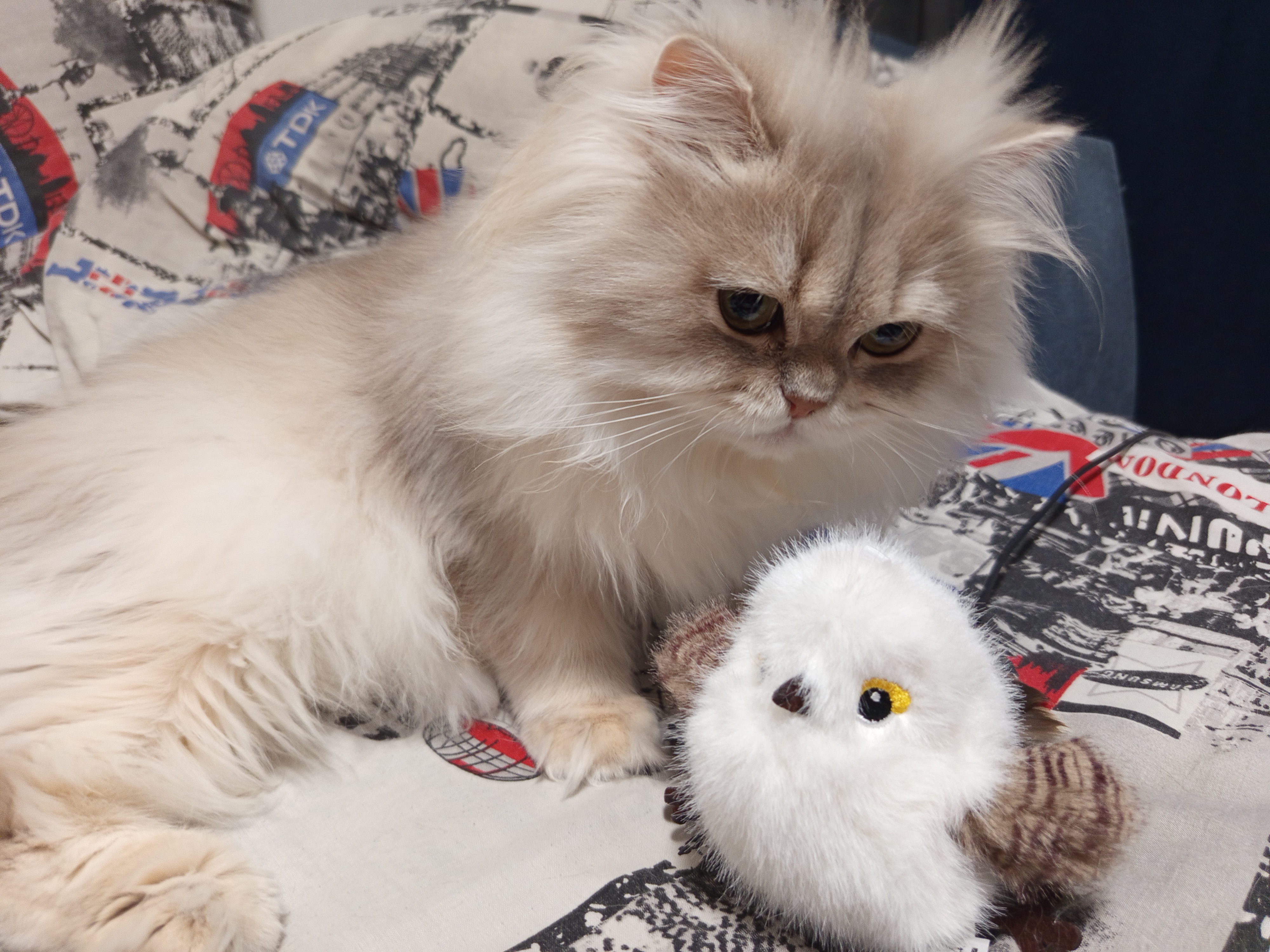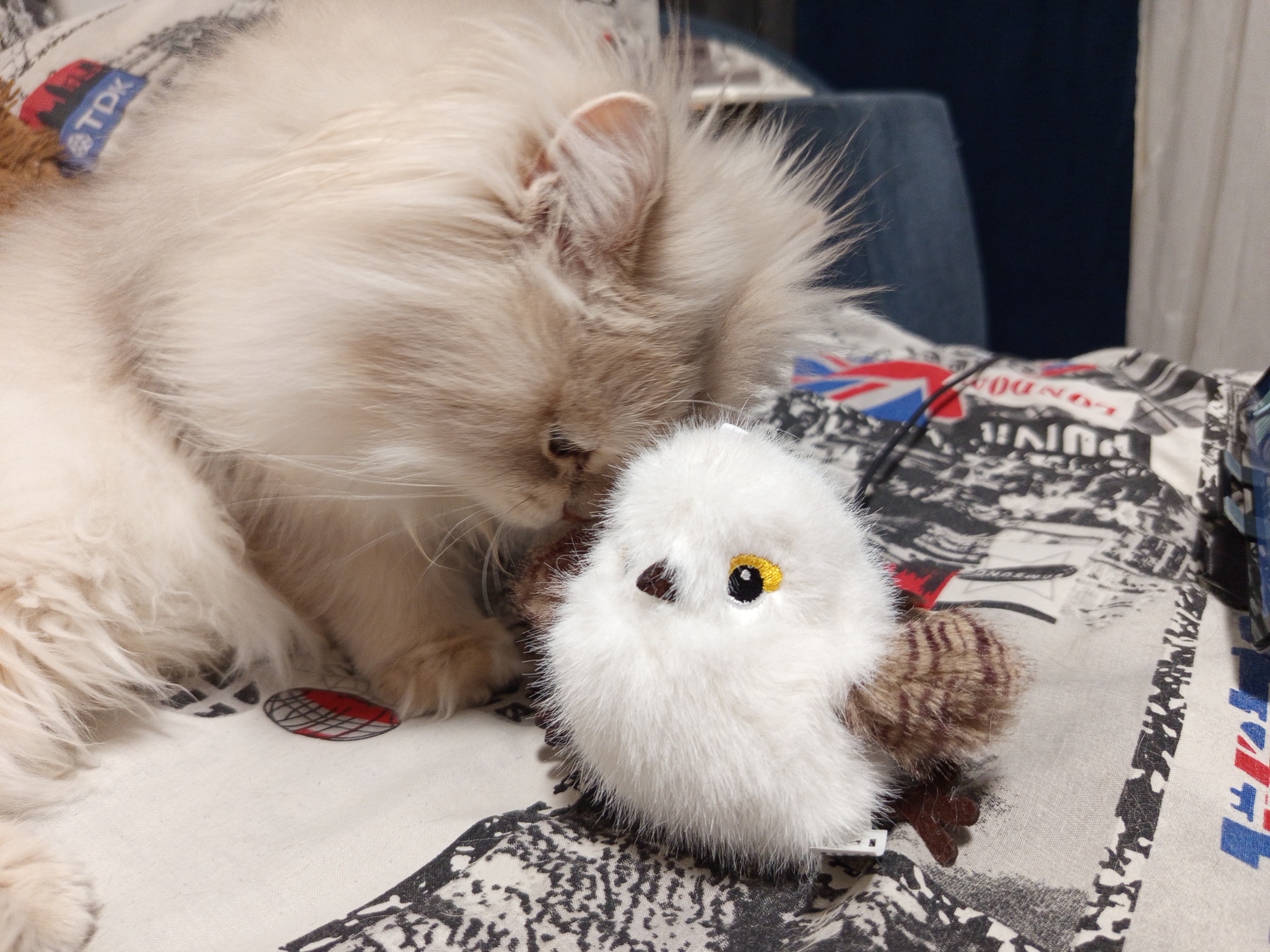 Боже Мерлішка як ухопила це курченя, навіть не дала йому зарядиться і кусала і лизала і за хвіст тягала. Арчик більш стриману мав реакцію, ну так йому вже більше двох рочків то він вже серйозний пацан. Але також проявив цікавість. Короче це курченятко заряджається від USB та маше крилами і співає. Якщо котики жбурлятимуть цю іграшку лапами то вона реагує.