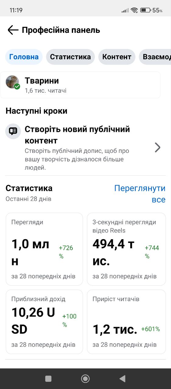 А стоп... Facebook. Продовжую заливати рілси в facebook, спостерігаю на реакцією публіки, дивлячись на статистику радує. Вже на сторінці зайшов поріг в 1 млн переглядів, це загальний рахунок за всі рілси які є на сторінці. Нещодавно було 800 з чимось тисяч загальних переглядів. І нарахували трохи грошенят, що також радує.