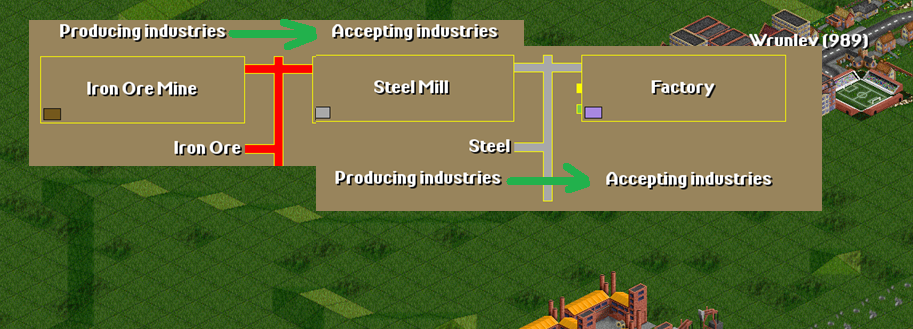 Iron Ore (from Iron Ore Mine) → Steel Mill → Steel (from Steel Mill) → Factory.