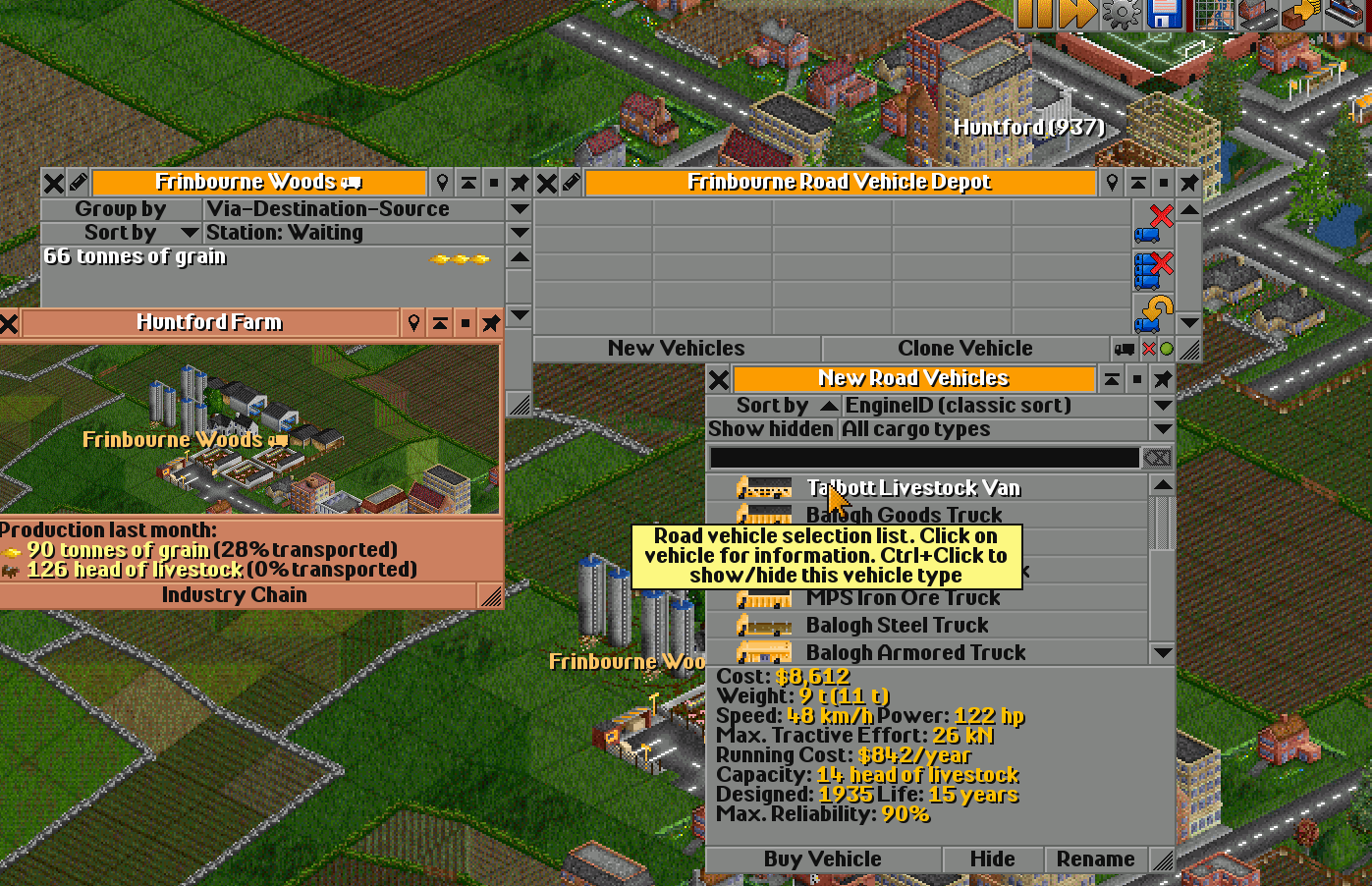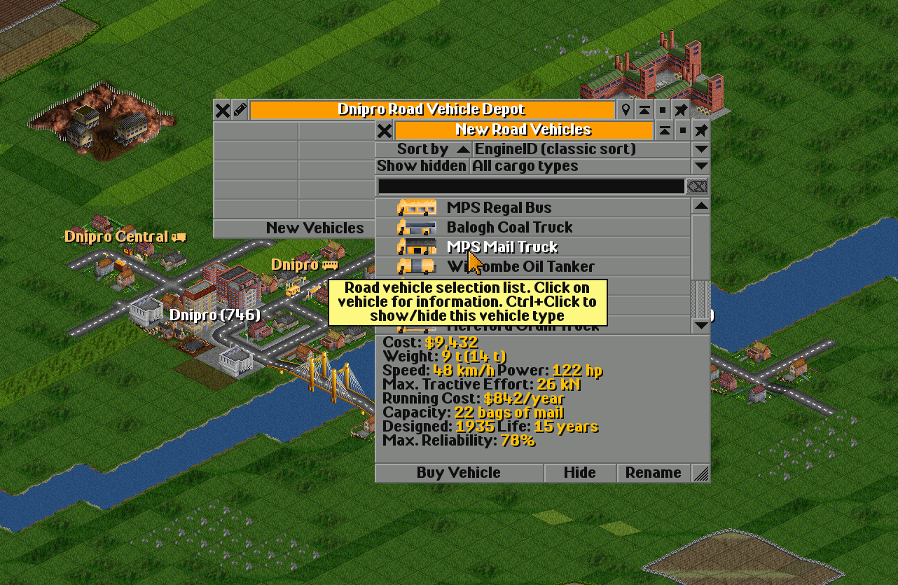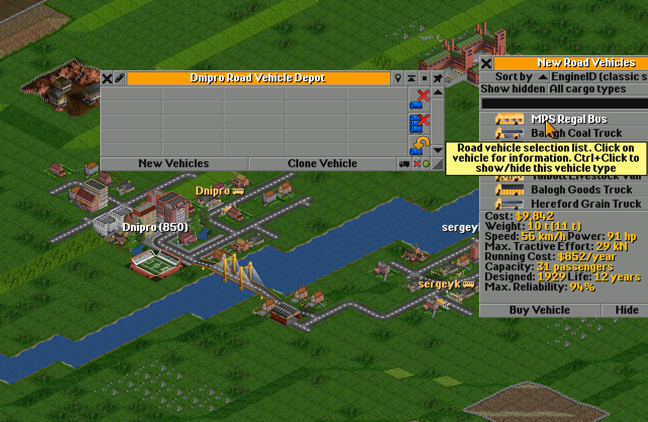 Clicking on the depot opens its window. Then you should press New Vehicle, which will show a list of available transport — this list changes over time. Some vehicles become obsolete, and new ones appear.