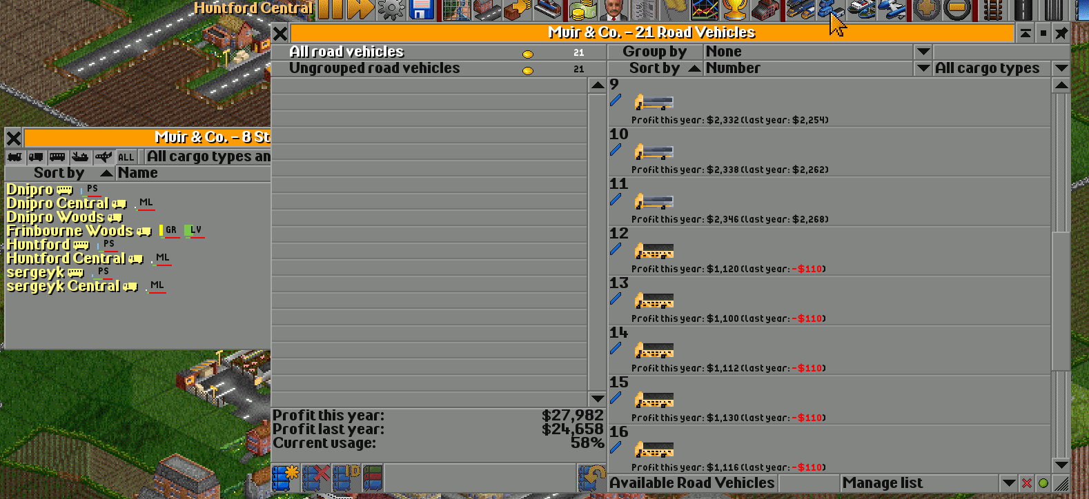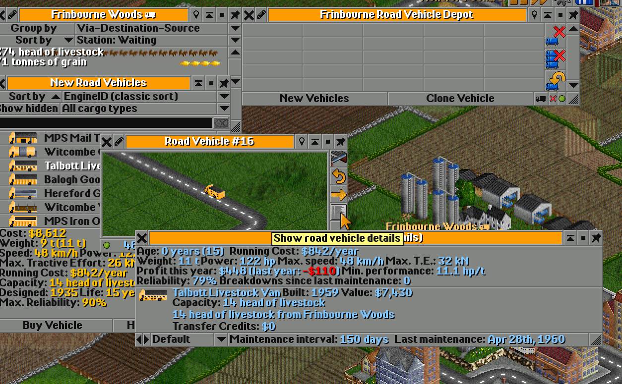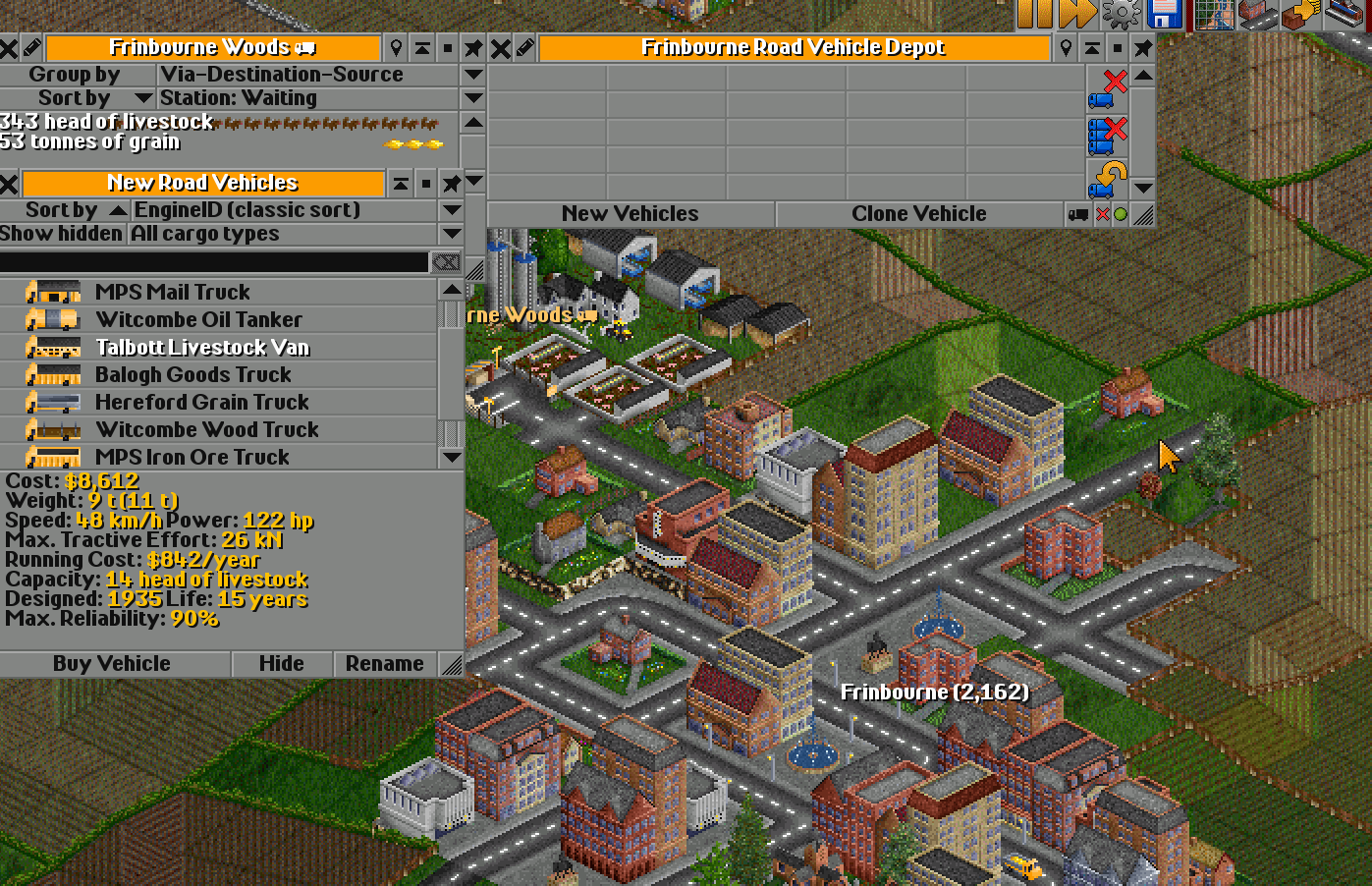 Clicking on the depot opens its window. Then you should press New Vehicle, which will show a list of available transport — this list changes over time. Some vehicles become obsolete, and new ones appear.