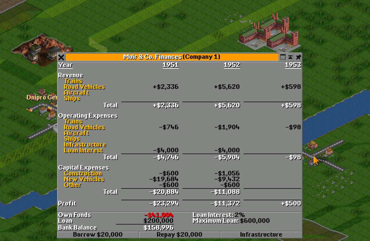 The window also shows expenses for purchasing and maintaining vehicles and infrastructure.