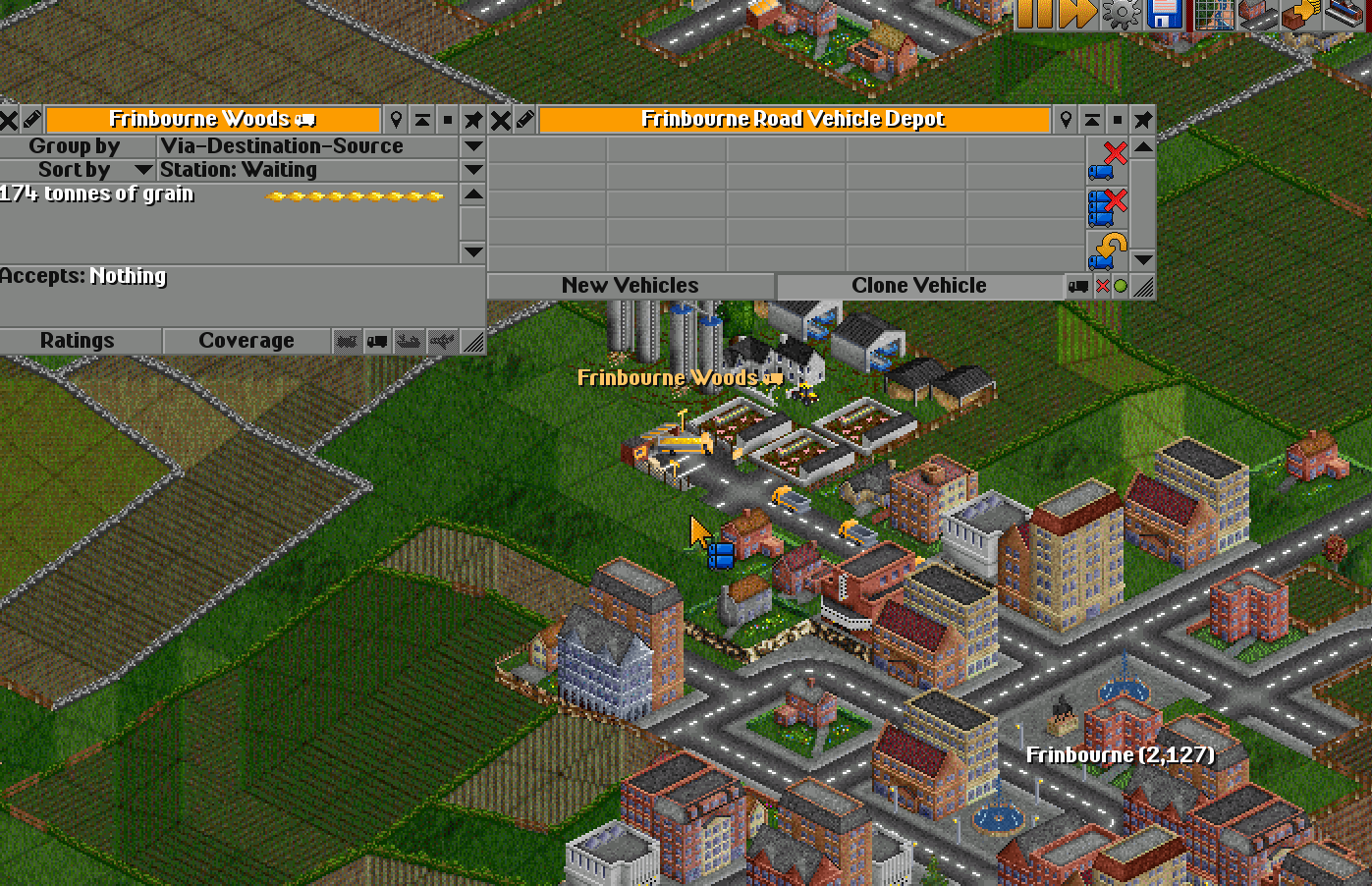 See how much grain has accumulated at the station? Now I’ll buy a few more trucks — but this time, by cloning.