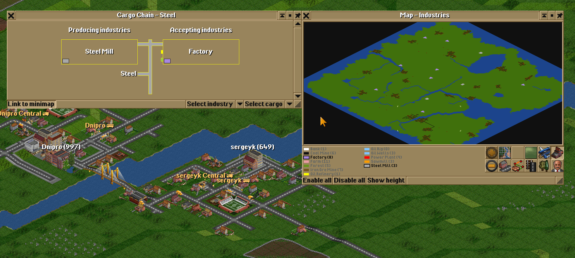 In the example, I selected Steel — so on the minimap, only the industries that produce and accept steel are displayed.