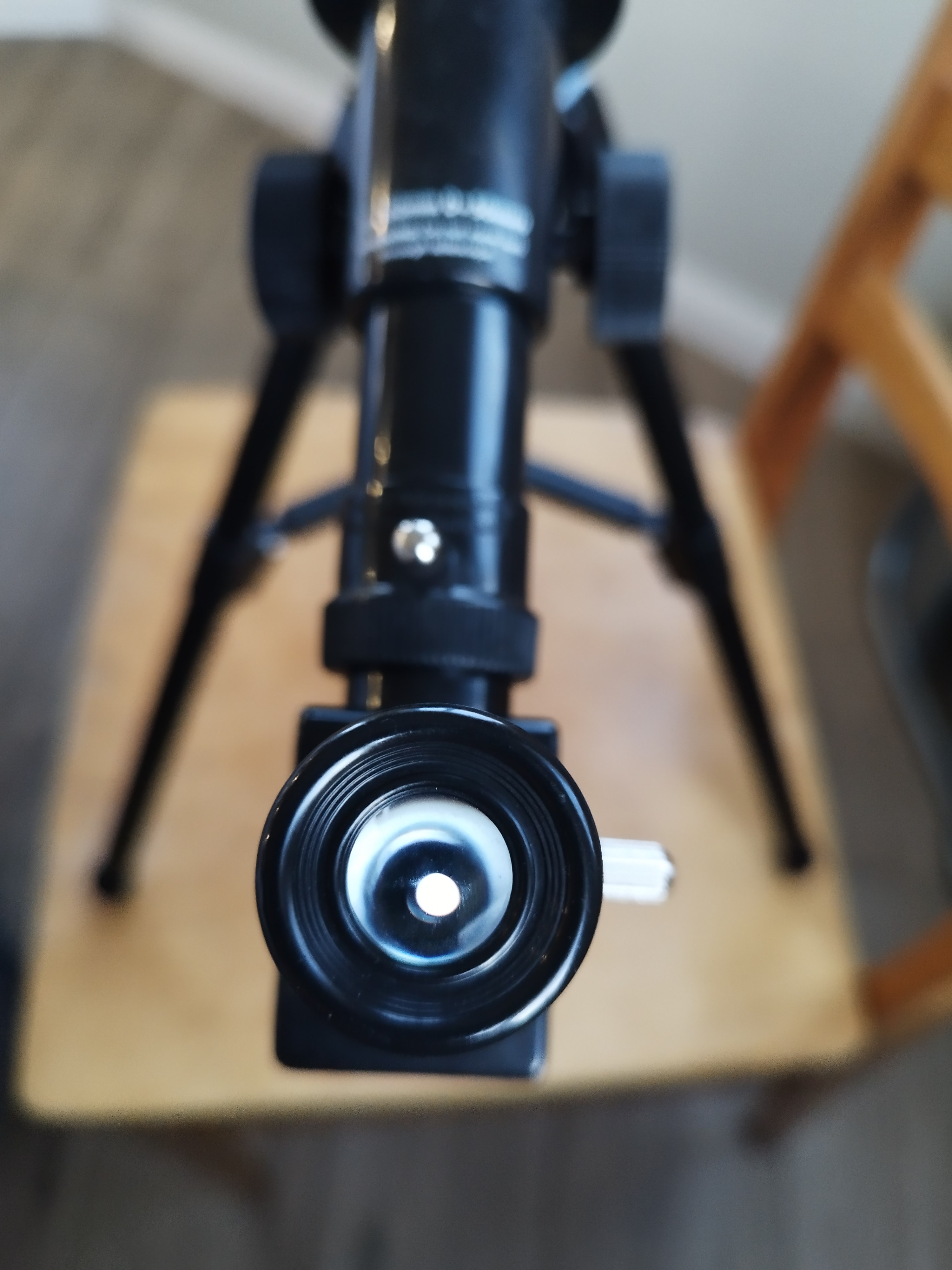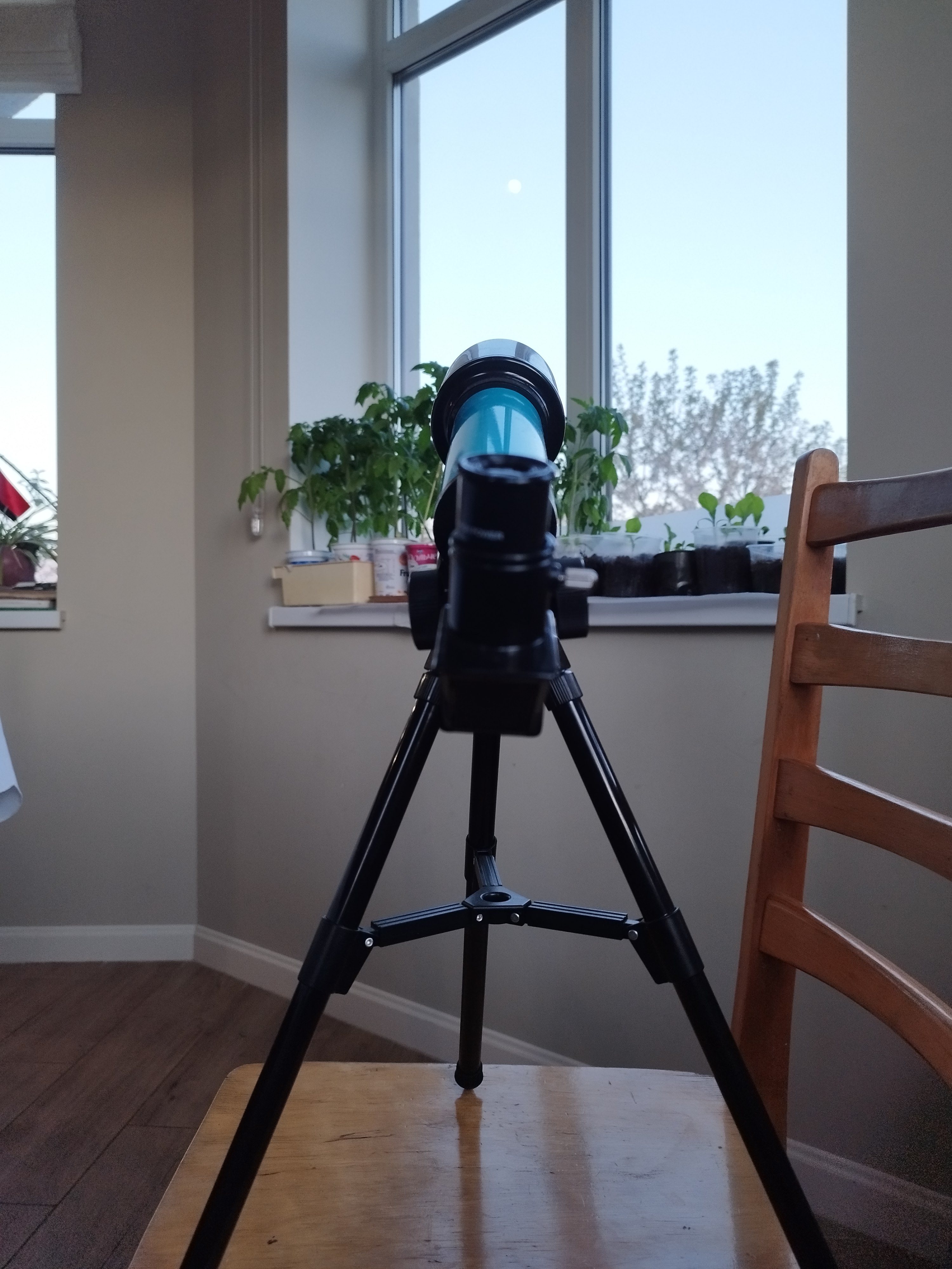 А сьогодні все зійшлося: дружина помітила Місяць і каже — можна нарешті подивитися через телескоп. Вона все сама налаштувала, я тільки прийшов, глянув в окуляр — і справді, вже було на що подивитися. Місяць виглядав трохи більшим, ніж неозброєним оком, добре видно так звані «моря». Кратери, звісно, роздивитися не вдалося, але все одно це було цікаво.