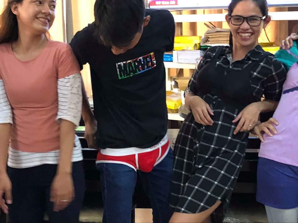 I received an underwear. Exactly, I am the one in the black Marvel shirt. That red brief is so tight yet comfortable. It was so stretchy, for my Pete's sake. And we have to wear our gifts. In our office. What were we thinking?
