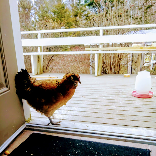 A few weeks ago I rehomed most of my hens as I knew I wouldn't be able to bring them with me to my new home. Scully was the exception, I just had to bring her, and so I did this past weekend. I set her up in my mom's garden, which is fenced to keep out the deer. At night I locked her into a wire dog crate in hopes of keeping predatory critters out.