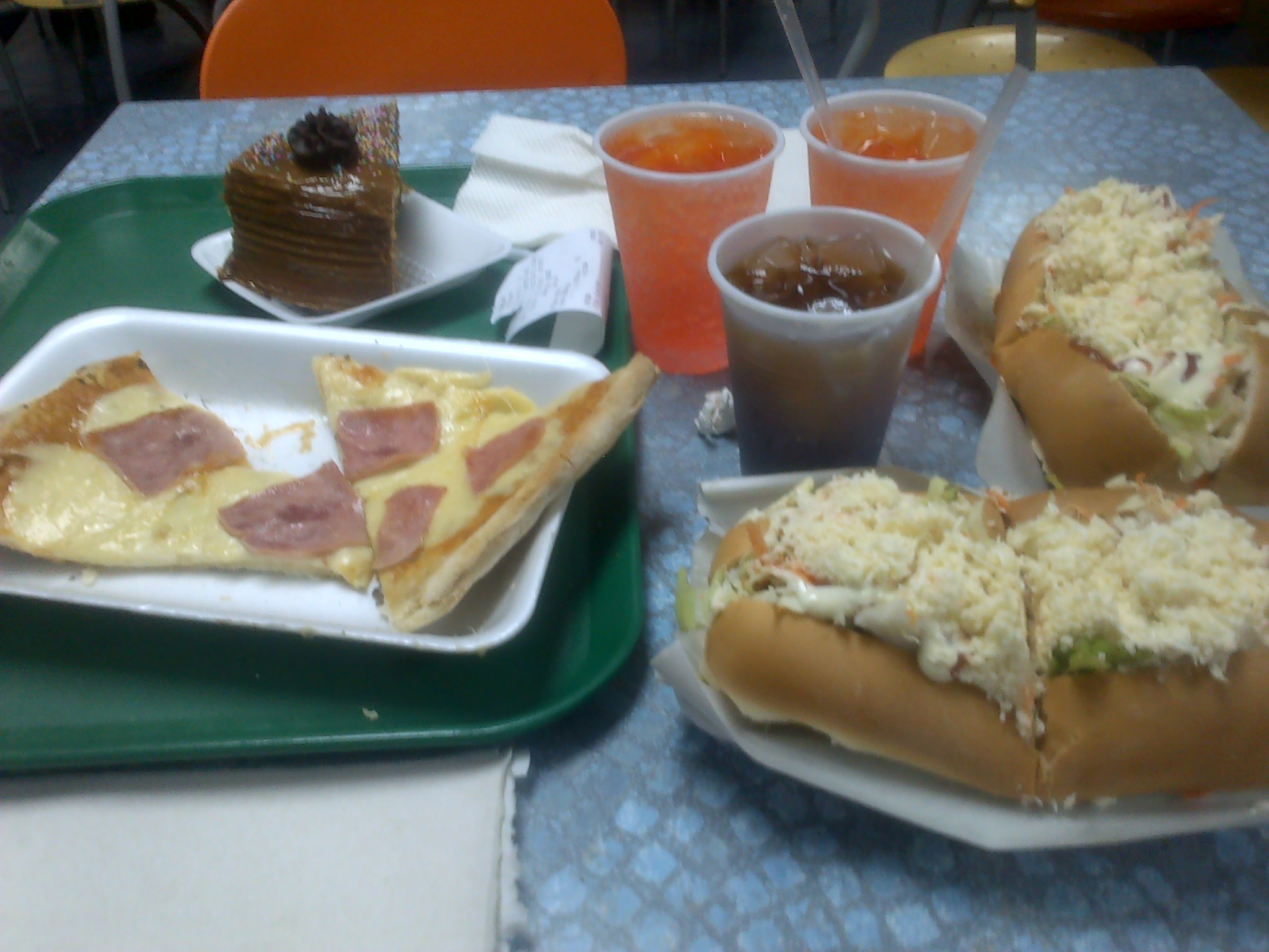 Aprovechando que nos habían pagado nos fuimos hasta allá para matarnos el antojo y vaya que lo hicimos... una vez allí no podíamos contenernos, queríamos comernos todo lo que había en la feria, por lo que nos decidimos comprar dos perros calientes, un combo de pizza y una torta de arequipe para completar jajaja