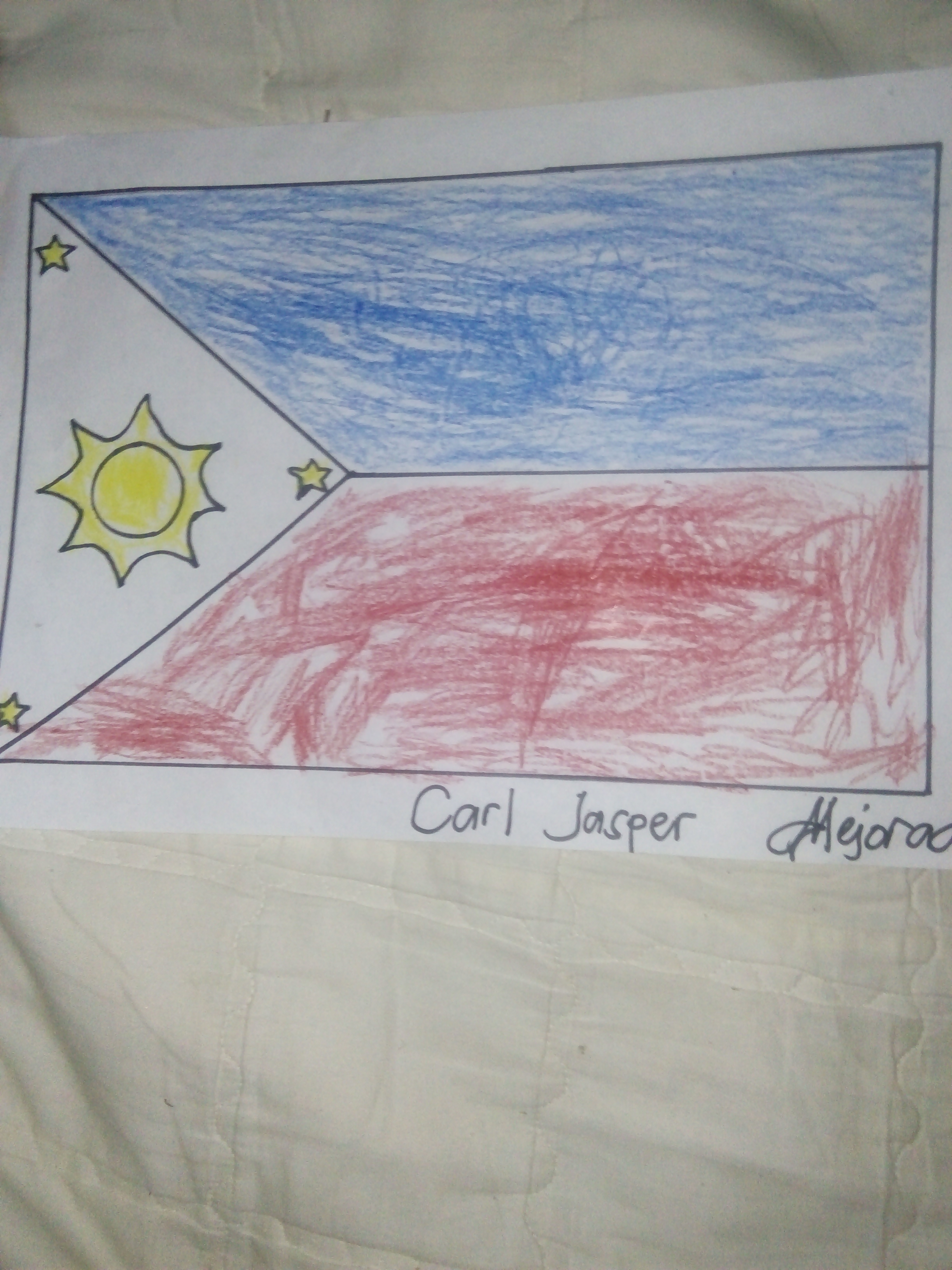And this is it our PHilippine Flag colored by my son. This is not as beautiful as you can see but I'm very proud of my son for this and that he made it even in a long period of time and different stroke, what matters most is that he did it all by himself and with eagerness to finished it. For me this is beautiful artwork. We really need lot's of patience in helping our child and I'm thankful to God for giving me lots of it which helps me much in assisting my son's studies.
