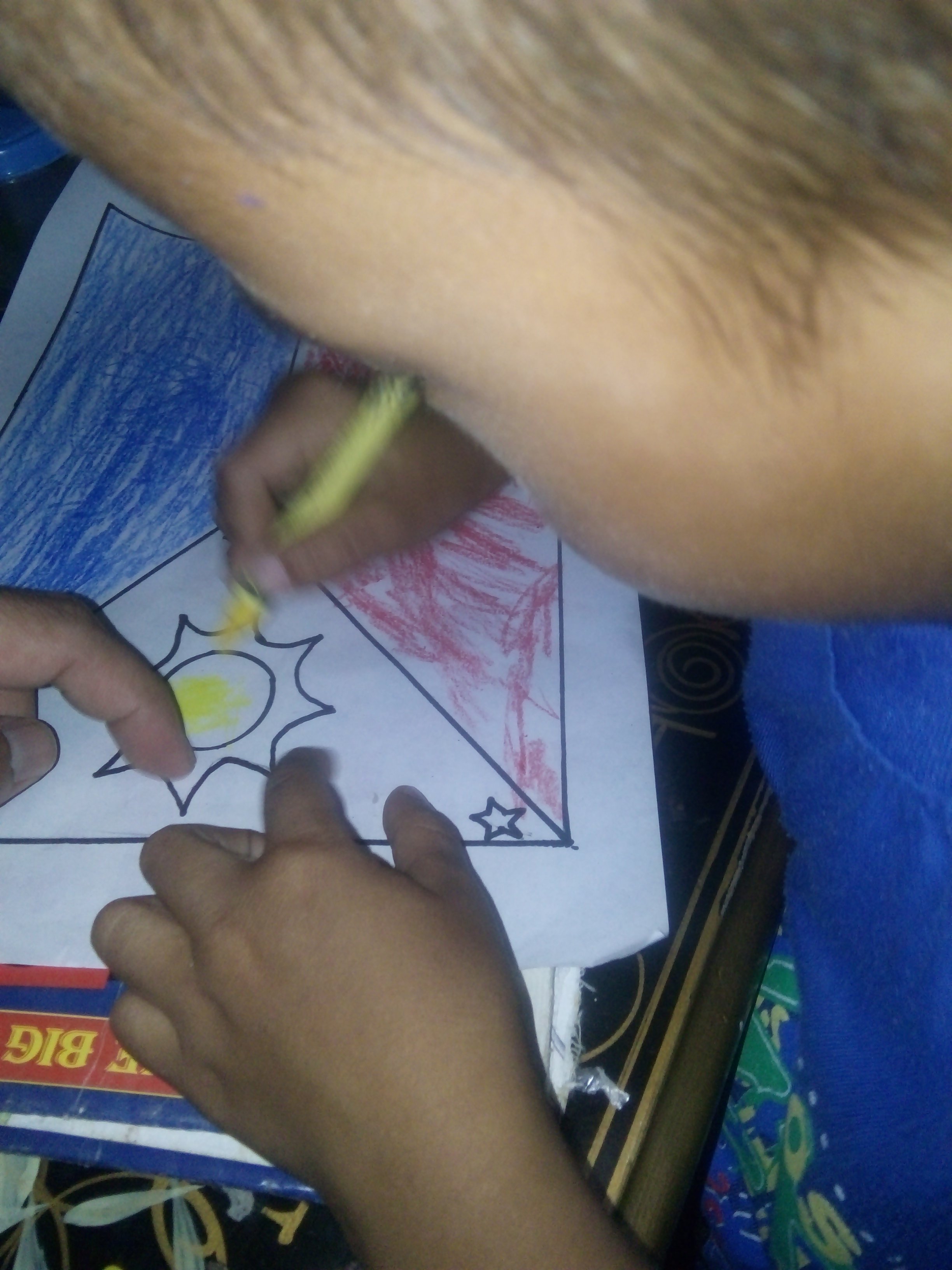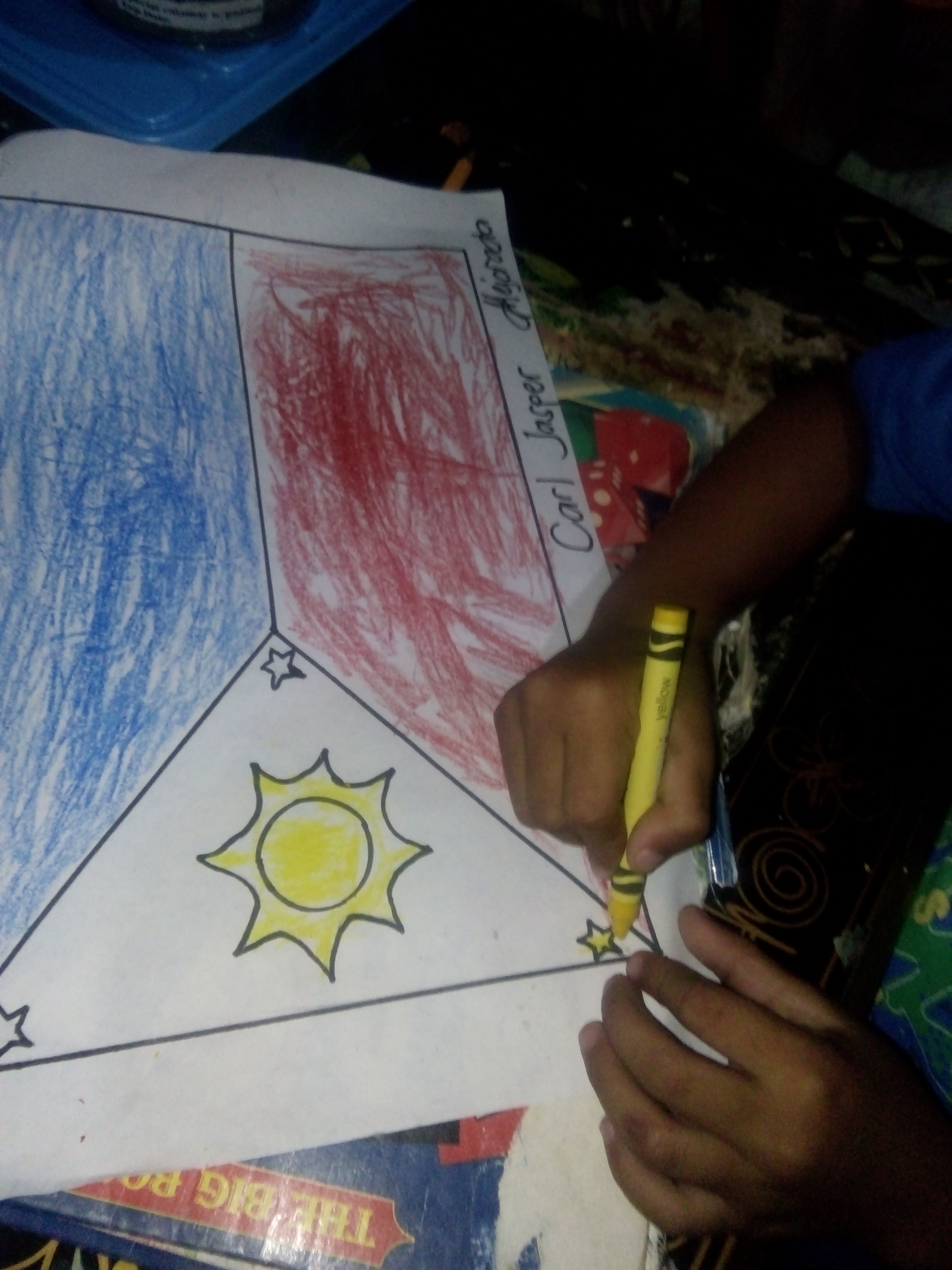 After drawing I let my son to finished the flag. Our flag consists of three colors, which are the primary colors (red, blue and yellow)I then teach him what color our flag made of and to where the color should be