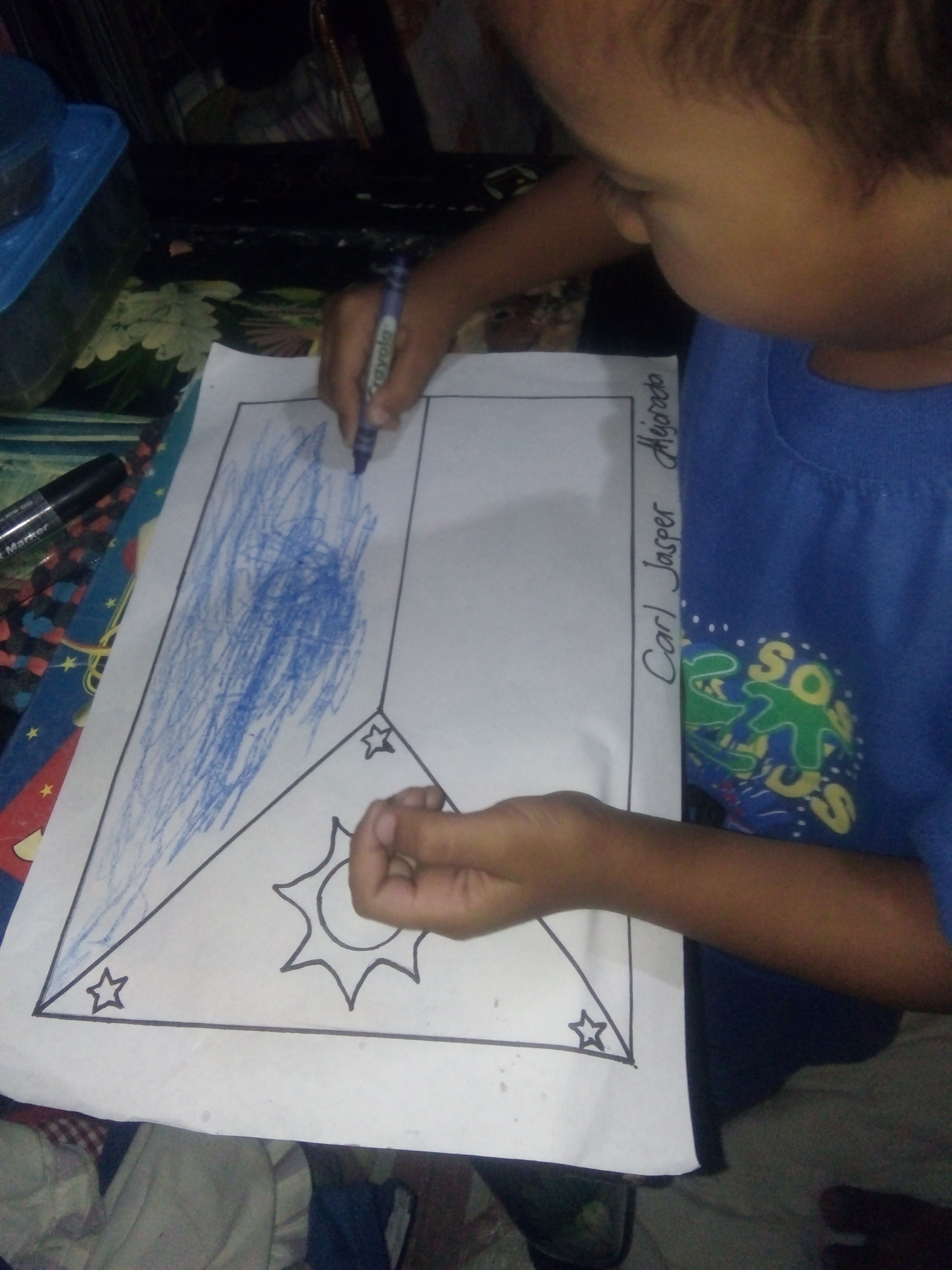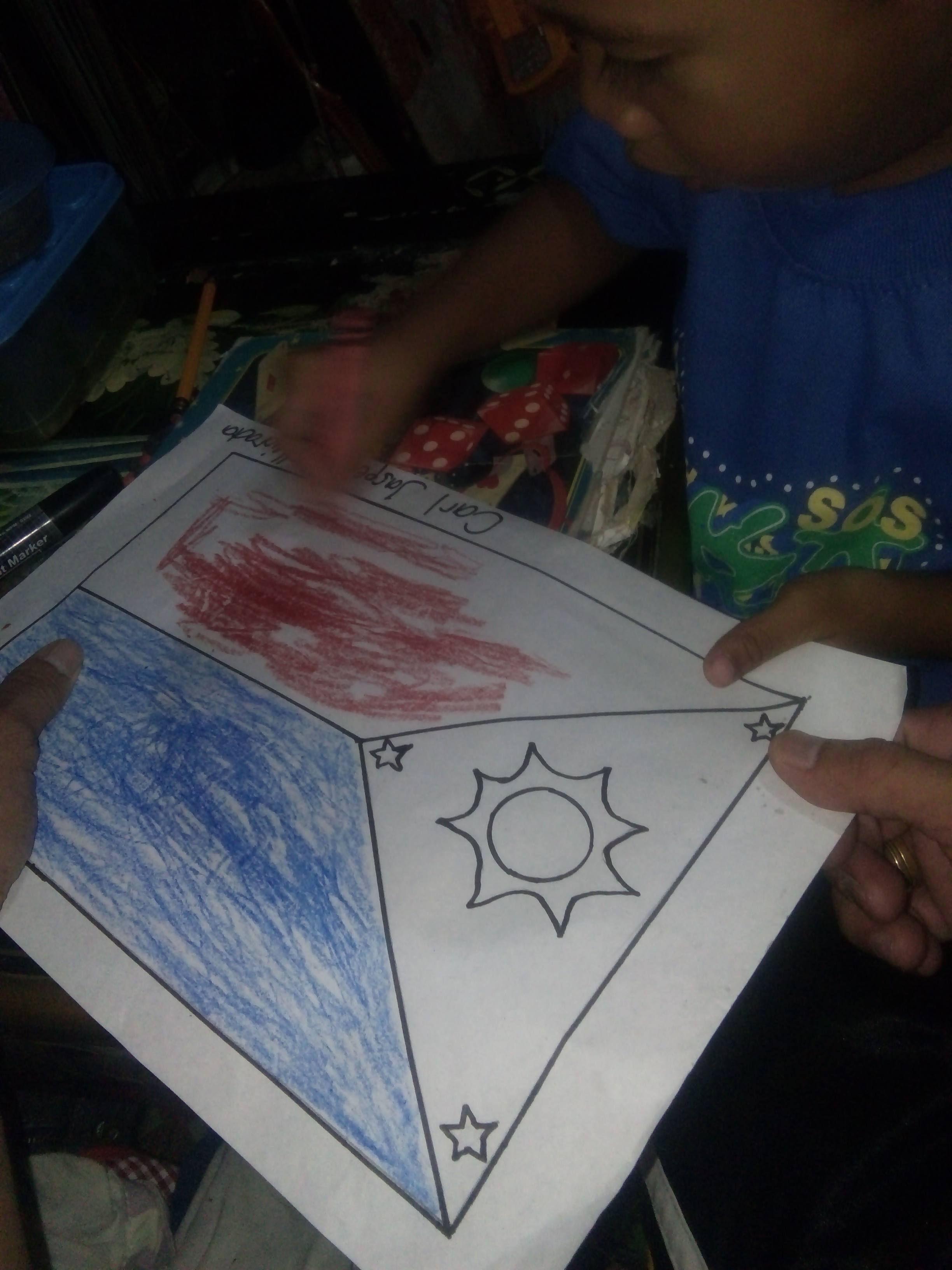 Since today is may day off I had all the time to teach and assist my son with his homework. For tonight I did help him with his assignment which is to draw our Philippine flag. Since he's too young and is not familiar with the flag I did the drawing for him.