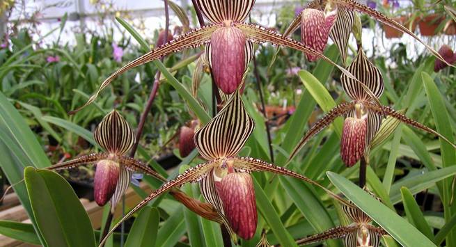 La orquídea de oro de kinabalu es una especie actualmente en peligro de extinción pues esta tarda por lo menos 15 años en florecer sus pétalos se abren horizontalmente y puede florear en grupos de hasta 6 grandes orquídeas .