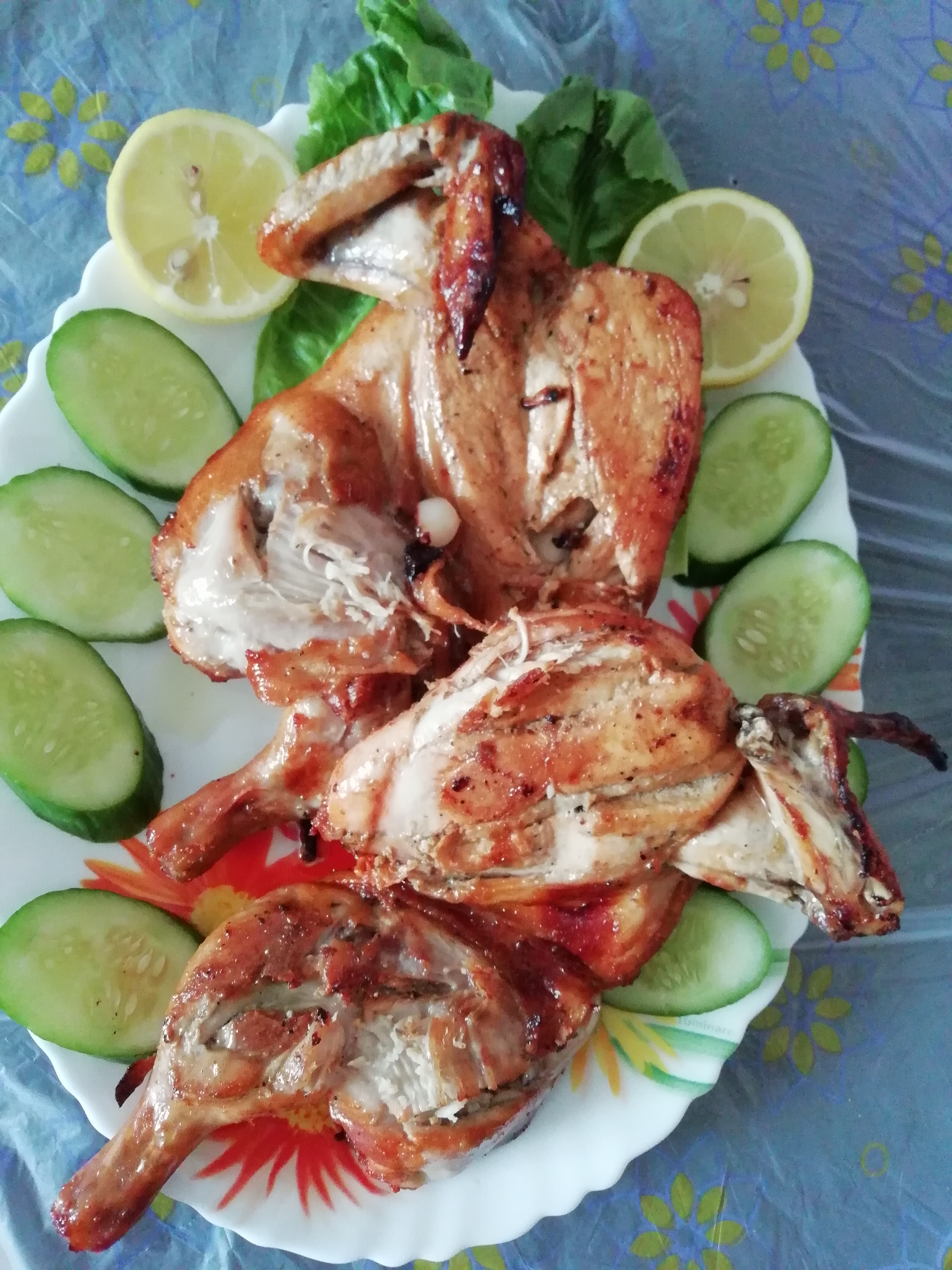 First clean the chicken, rinse with lemon juice and drain. Mix grounded black pepper, minced galic and chopped oninons. Add a bit of salt, arabic seasoning and a pinch of food coloring.
