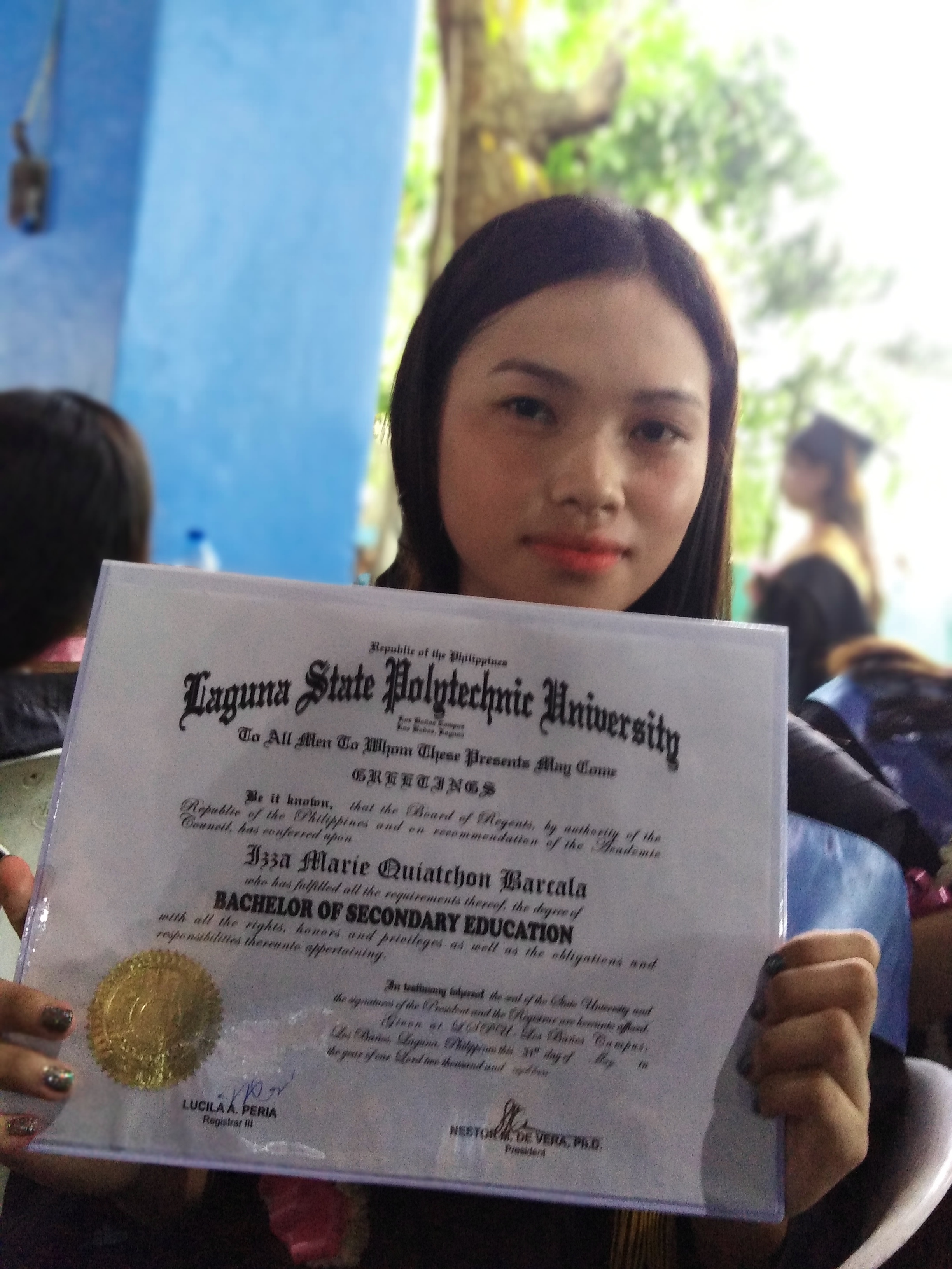 I just graduated last May 31, 2018 with Bachelors Degree in Secondary Education Major In Music,Arts, Physical Education and Health In Laguna State Polytechnic College. This course is 4 years in the making but I took it up within 5 years for the reason that I stop schooling when I was in second year collage due to financial reason. But that doesn't stop me to strive for my dreams I continued after a year until I graduated.
