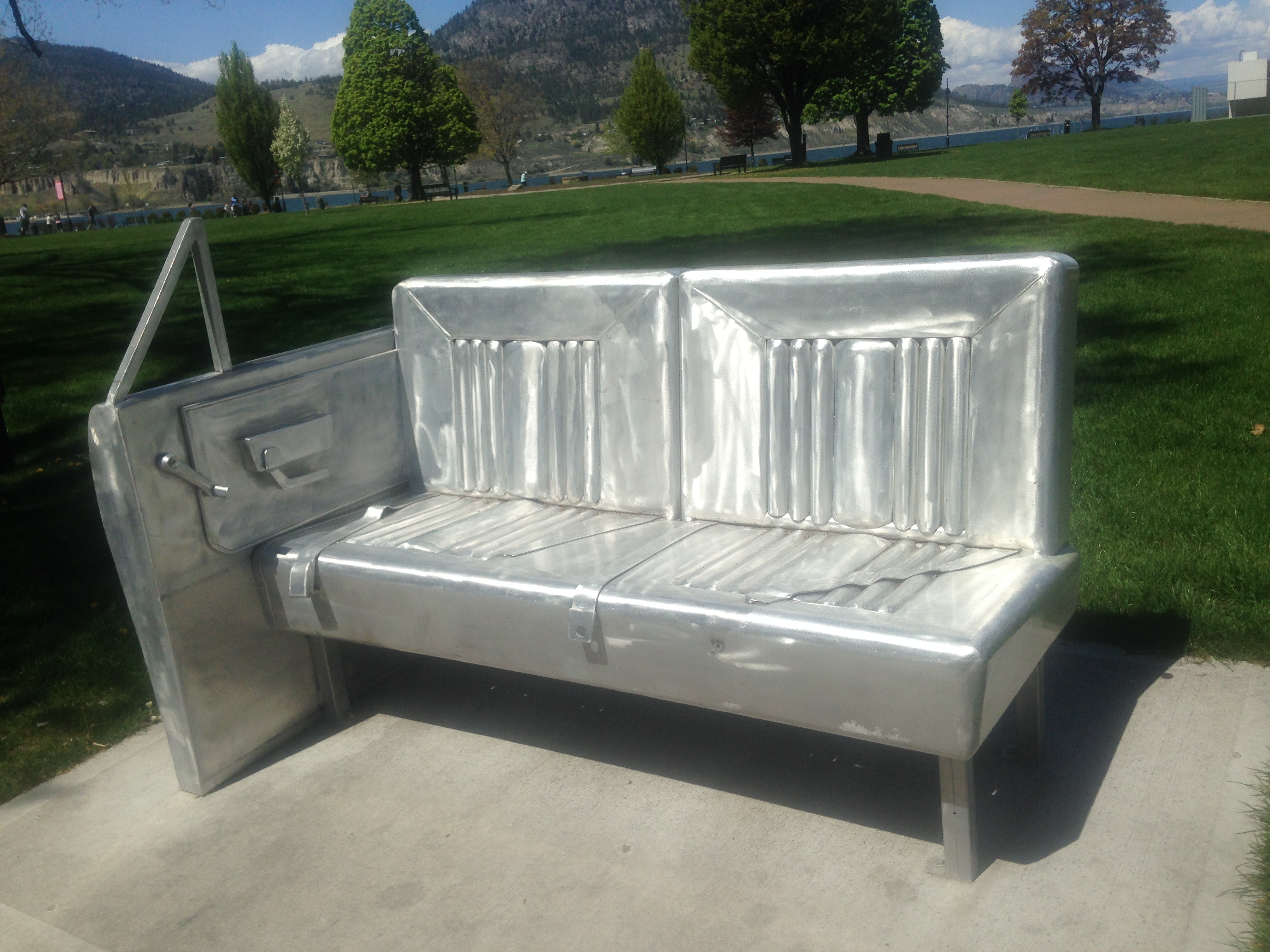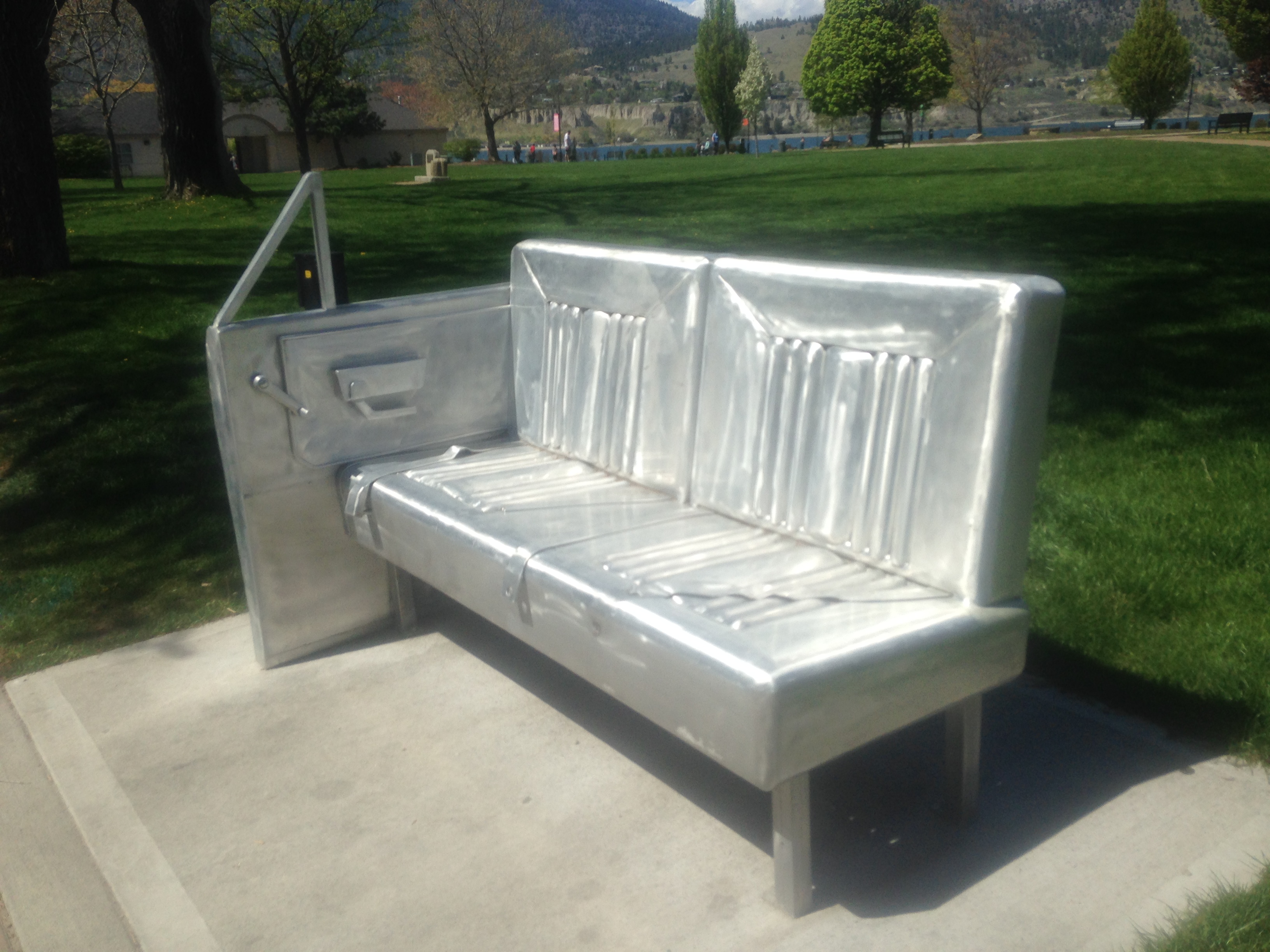 This cool bench is located right at the Penticton Lakeshore Park. It is pretty neat. A car seat made out of steel and it even has the seatbelt laying on it.