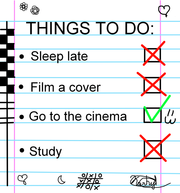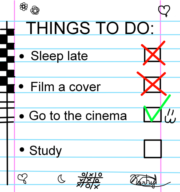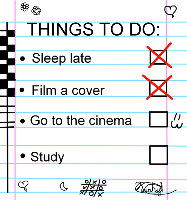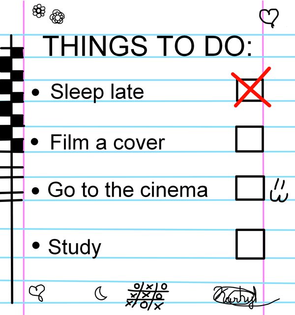 I’ve been waking up at 5am for 4 years from Monday to Friday and I forget that I have the habit of waking up early, today I wake up like at 5:30am and I couldn’t sleep again so I passed the morning watching TV and practicing the song for the cover. Sleep until late was the first fail in my list of things to do.