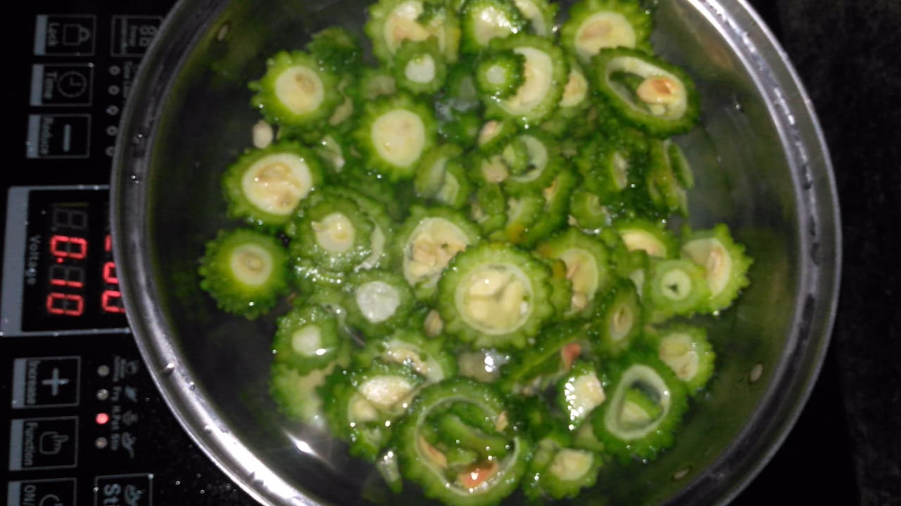 collect some fresh bitter guard then wash it properly. Here, you can see I was cutting them in a round shape, as it is time-consuming. Haha ...Ok, if you want to reduce its bitterness, then add some salt and boil it for 5 minutes as shown the below picture.
