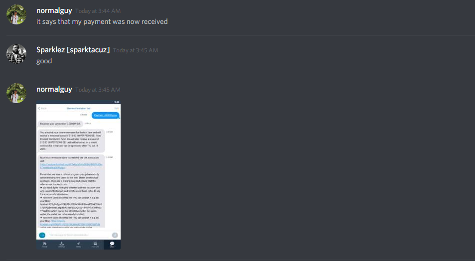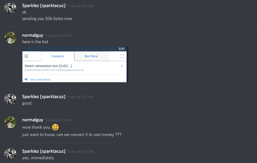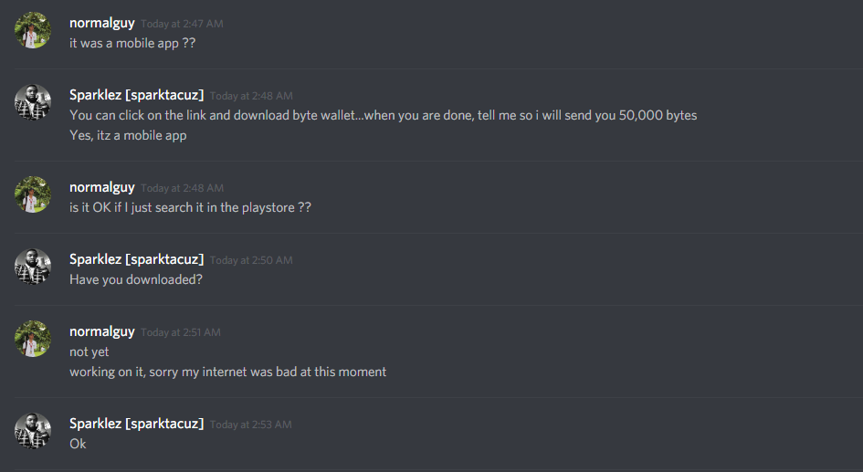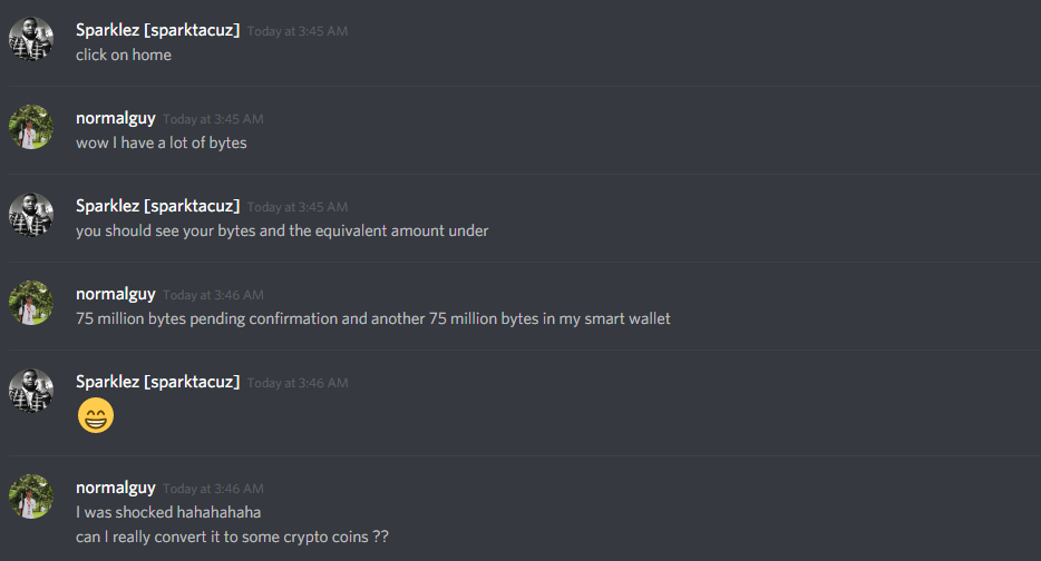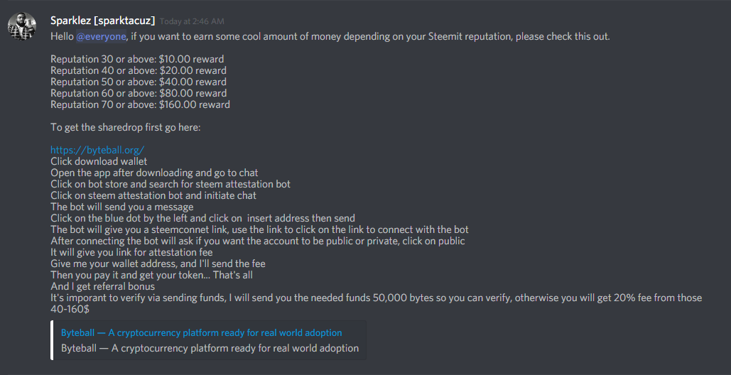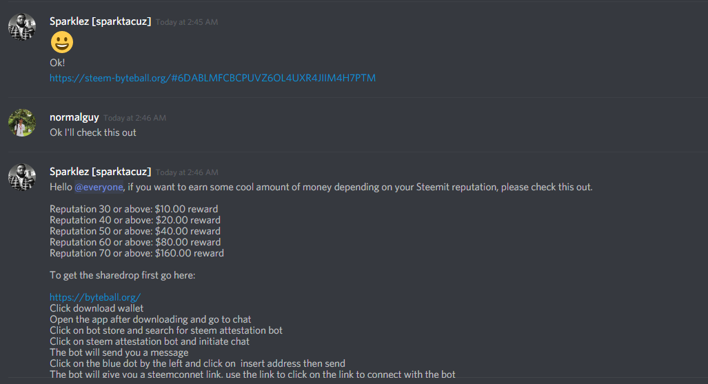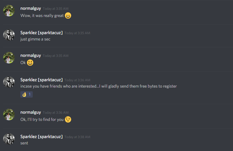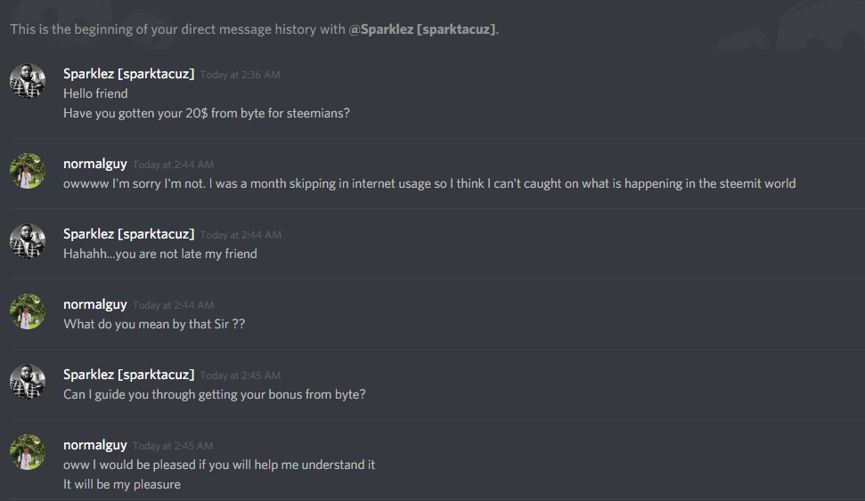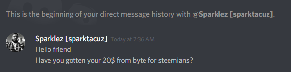 A man named Sparklez[sparktacuz] a.ka. @sparklez send me a message asking me if I got a $20 worth of byte with my steemit account.