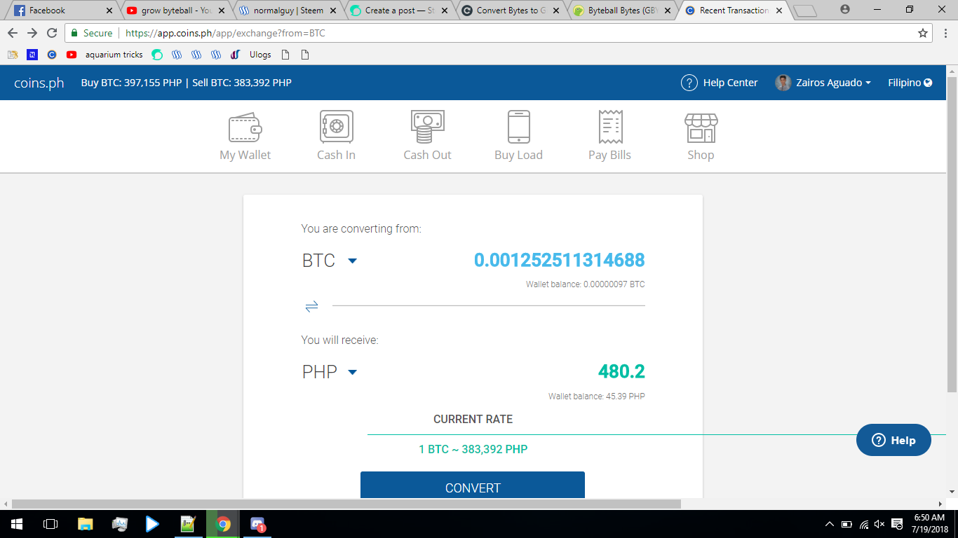 Now that I have converted my 75, 797, 117 bytes to Bitcoin I opened my coins.ph and try to convert the Bitcoin Value of my Byte coin