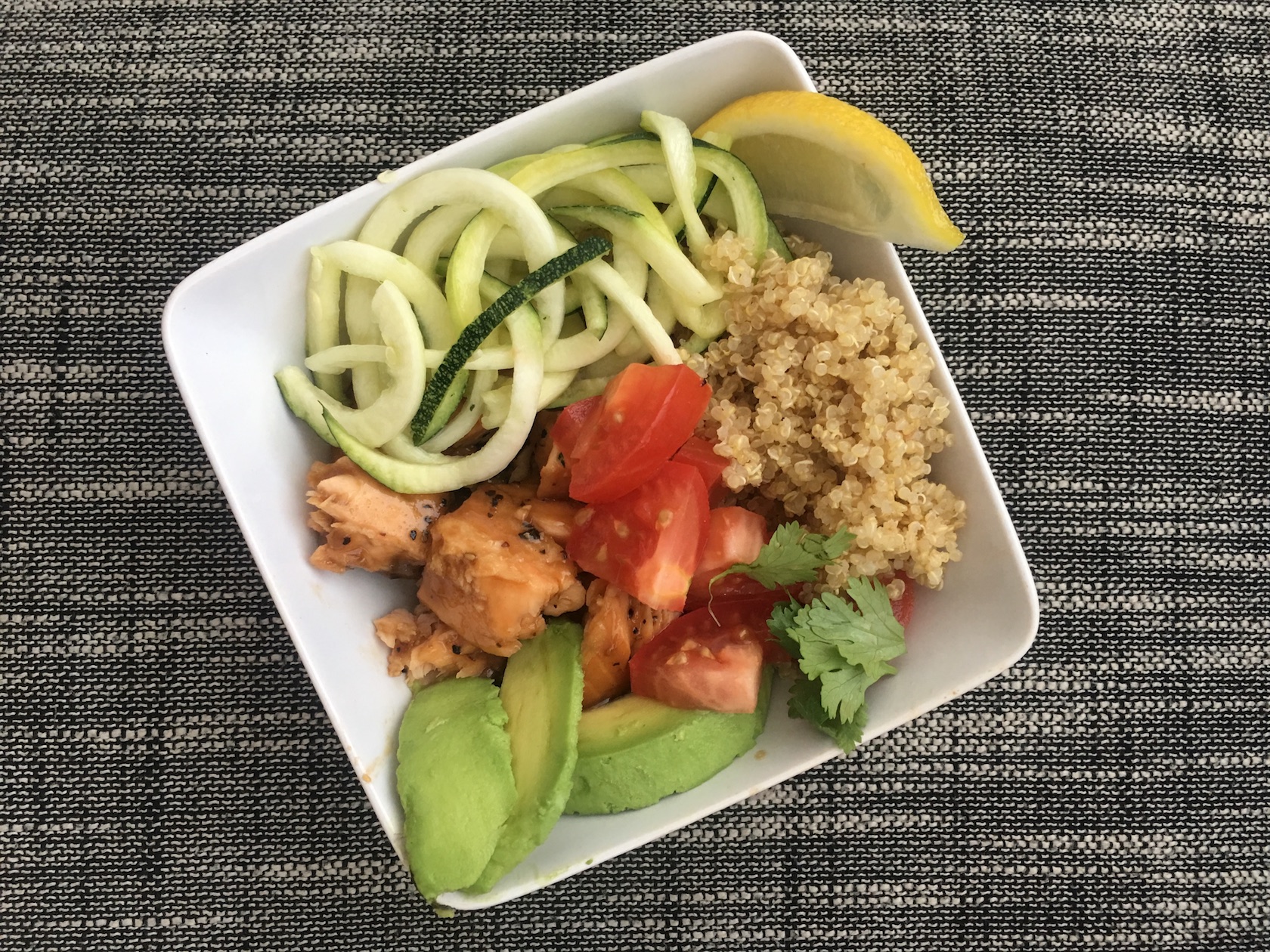 I'm a big fan of fish so it was an easy choice when we came across this BBQ salmon recipe. We did decide to buy pre-marinated BBQ salmon that was on sale at the supermarket, which made the meal that much easier to throw together. The zucchini noodles can be purchased as well if you aren't about that life. After a little more slicing and dicing of tomatoes, avocados, and lemon the entire meal was complete in 30 minutes.