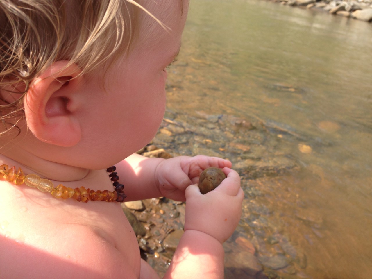 We found a big rock to sit on and I gently lowered you into the water.
