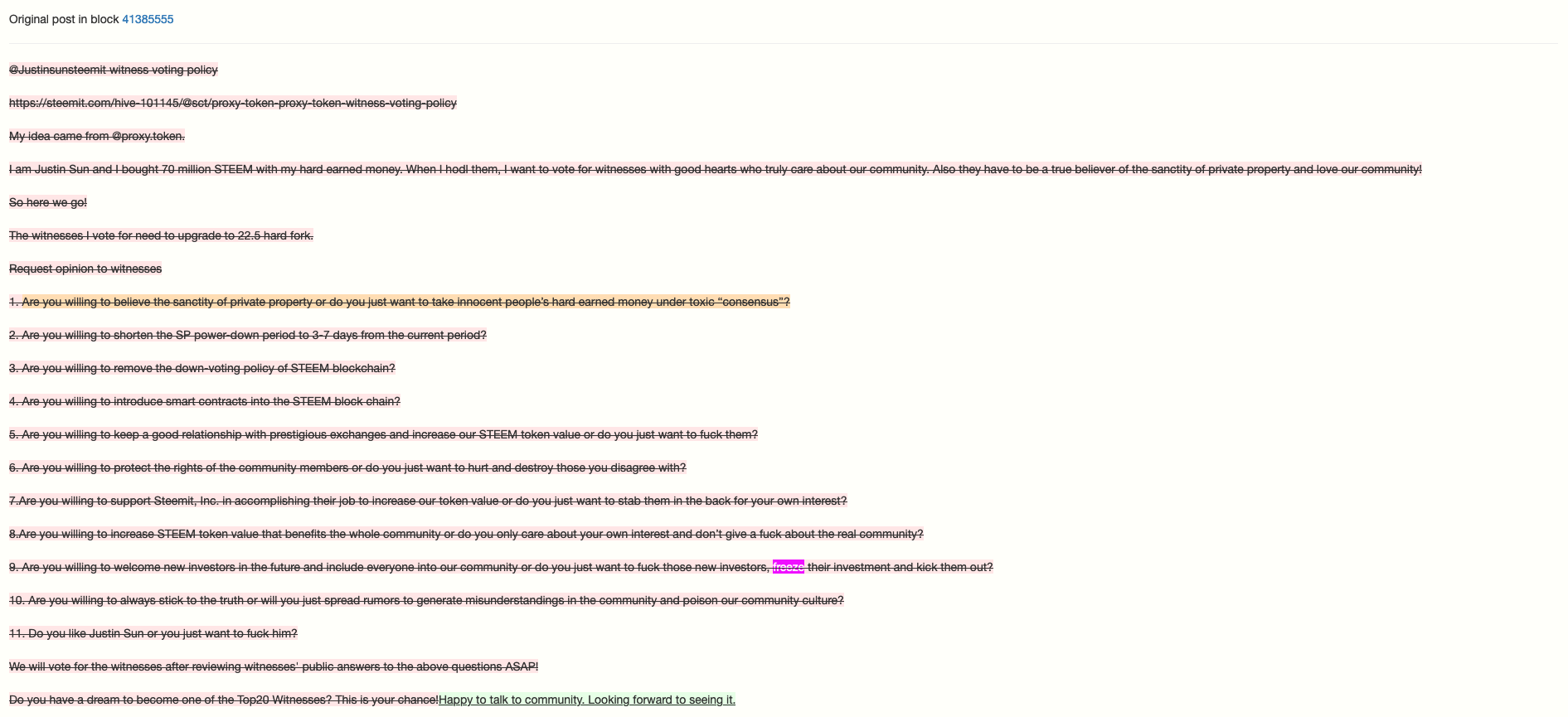 I think it's nice they delegated back to some community initiatives, but I'm seriously troubled by their freezing of stake when a few weeks ago, @justinsunsteemit made this post which he later edited. He spoke about 'the sanctity of private property' and now is directly contradicted by current witness voting of Steemit inc controlled @dev365 in which they support the freezing of private property by unvoting anyone not running the fork code to freeze assets. Blatant hypocrisy. This is why I find any good will by @justinsunsteemit aka Steemit Inc. to be just fake words. I guess time will tell what happens to Steem, I guess a lot of people still have hope.