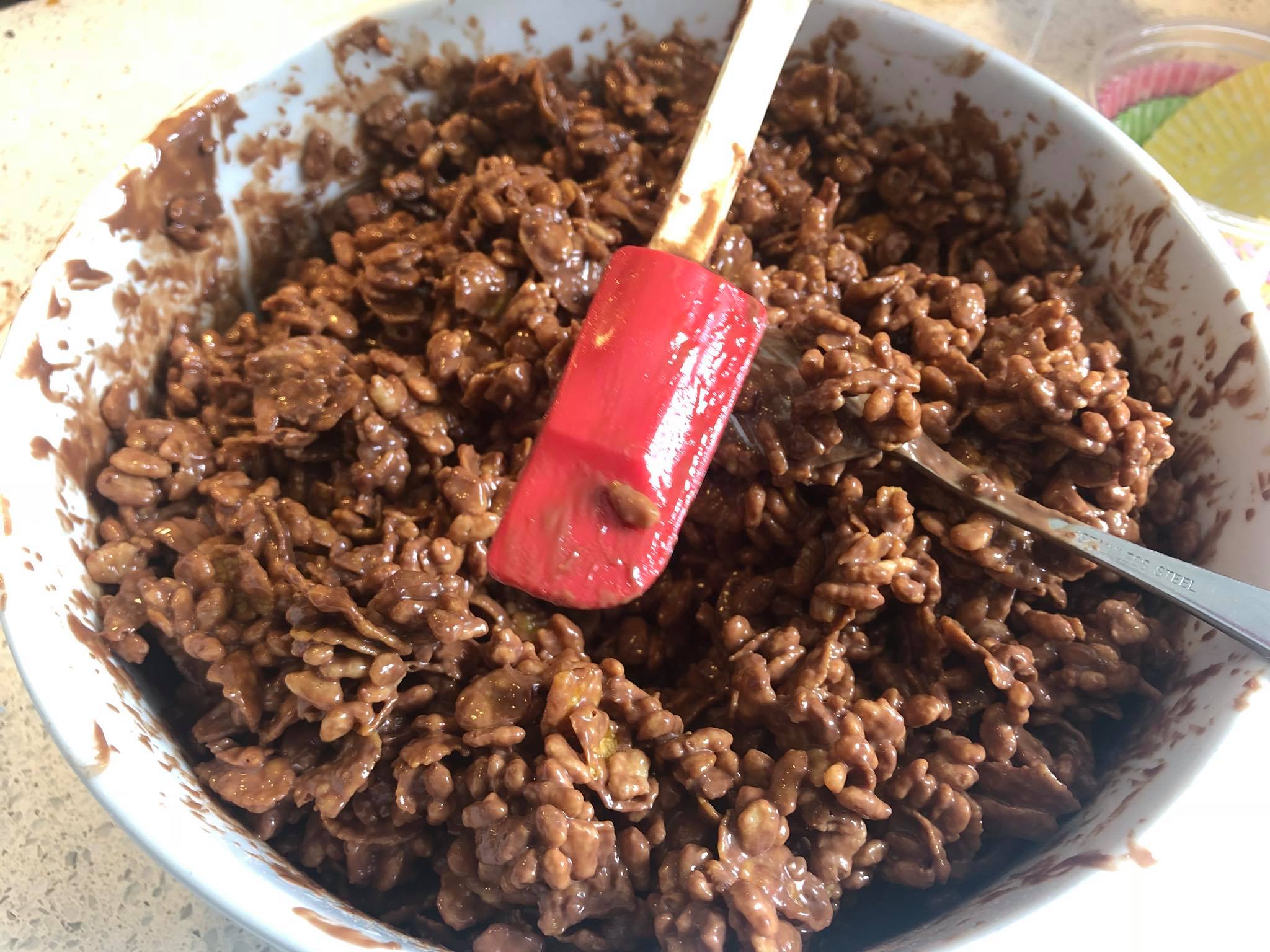 Add the Rice Krispies and stir in to the chocolate mix, gently