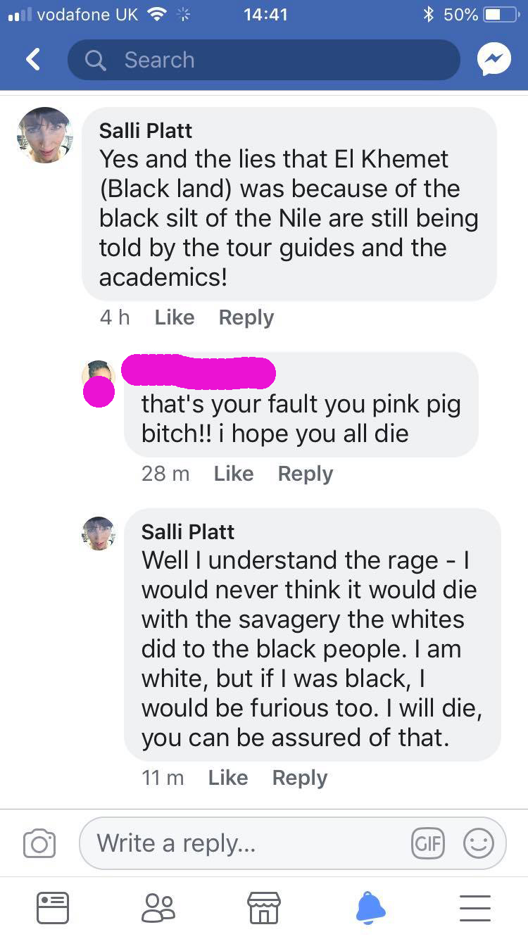 Here is said post, with the names masked to protect the innocent, guilty. I was merely putting my belief forward that Egypt (AKA "Al Kemet" ~ before the invading Greeks/Romans called it Aegyptus)... Was probably not called Kemet (which means "black land") because of some silt from the Nile. I may be completely wrong, but in my opinion, the reason is much more obvious than some black residual minerals from one river running through it.