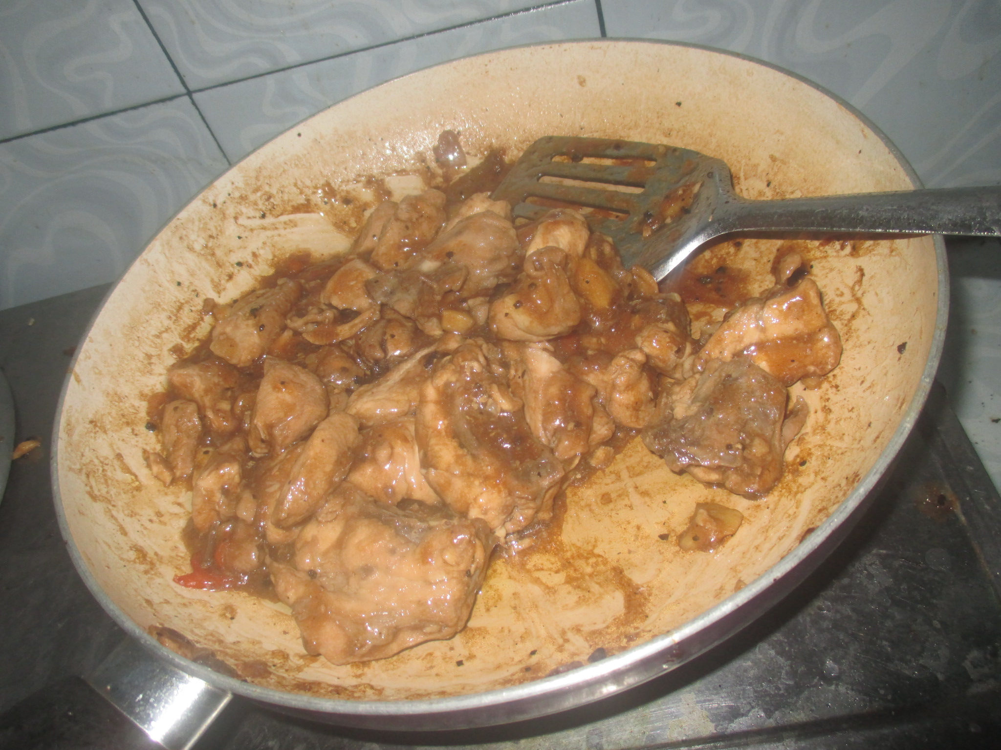 - For marinating, prepare the frying pan, make sure no water added. Put all the said ingredients, mix properly then wait until the excess oil of the chicken will get out. You can have it low or high heat in this part.
