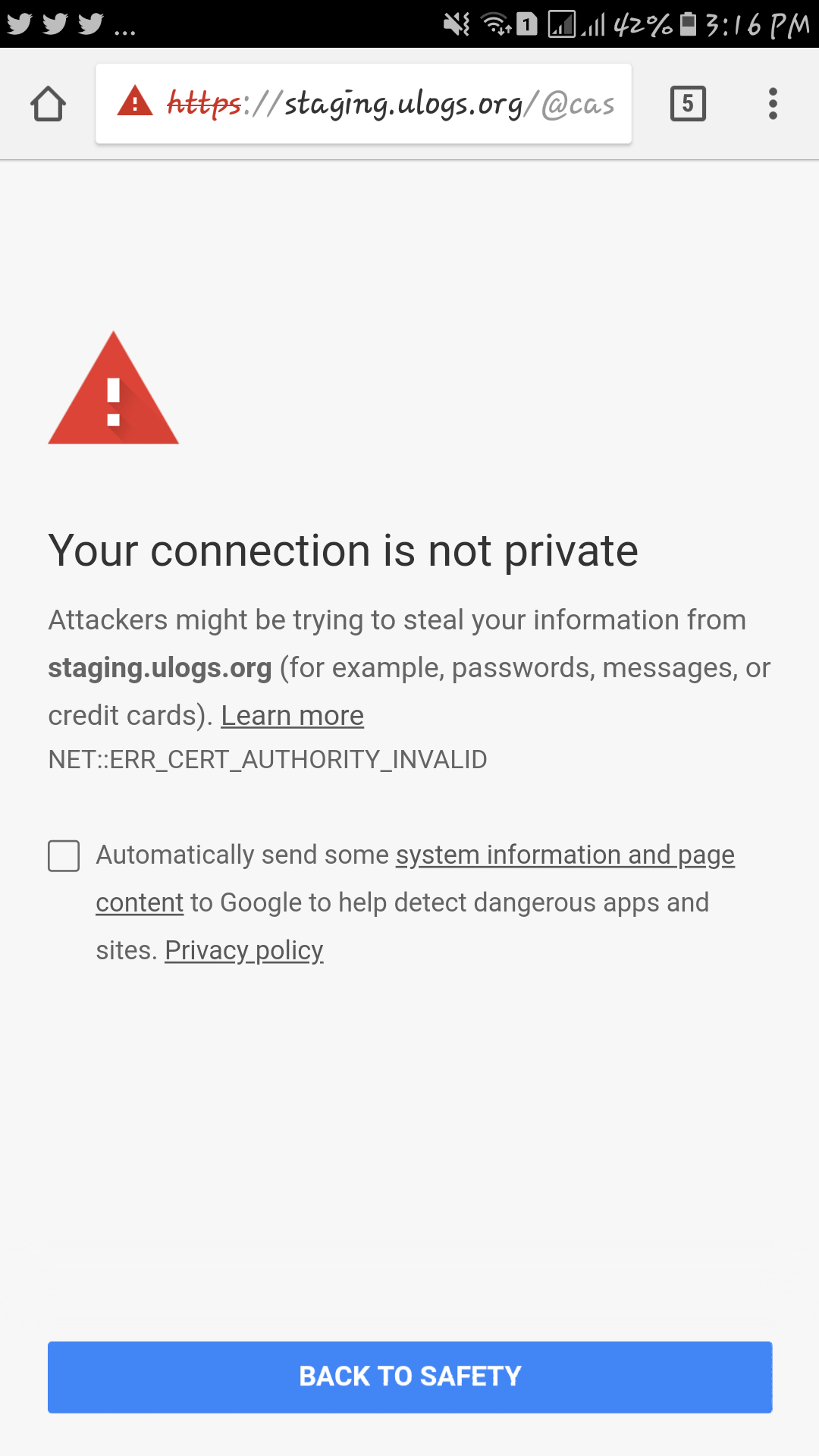Regading https://ulogs.org, everytime I go to the website, it always says that "YOUR CONNECTION IS NOT PRIVATE?" 😊😊😊 I am sure that our internet connection is not the problem. I don't know how to fix it.