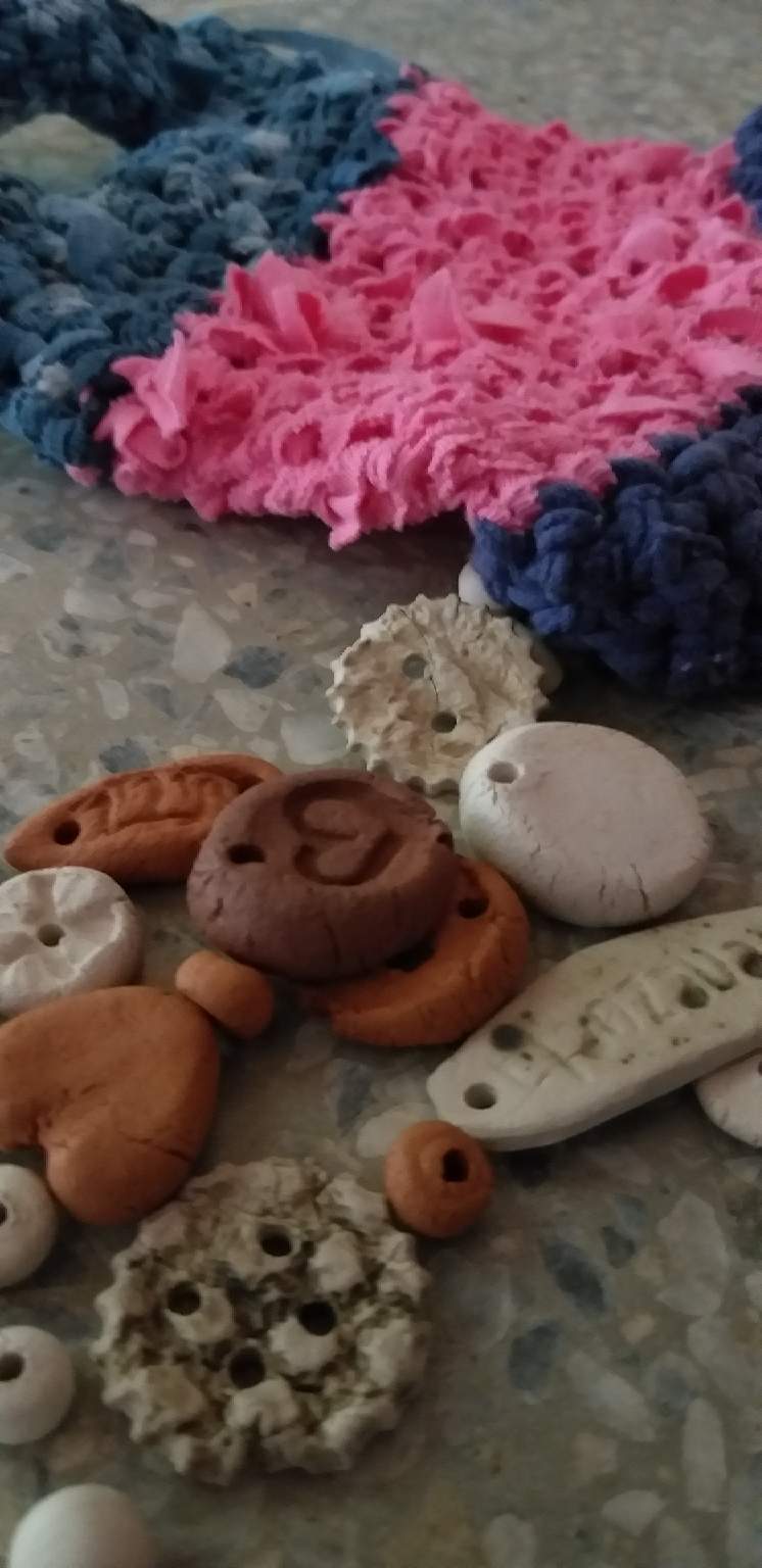 I had some clay hand made beads to add... because it is home made yarn it is not even and I left some thread to attach the beads