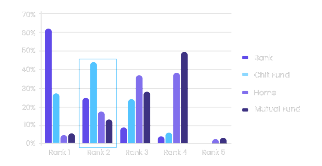 The estimated size of the Chit Fund industry is INR 35,000 crore (nearly 5 billion dollars) and is growing. The overall ranking of the preferred mode of savings according to the study: