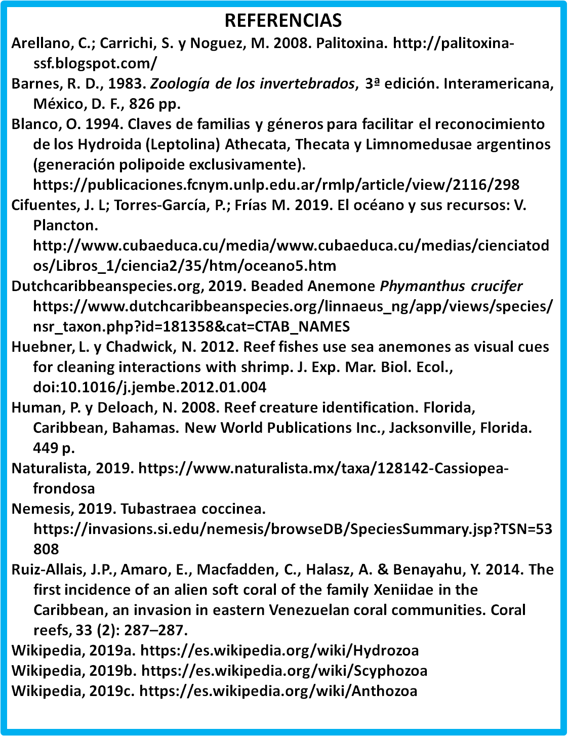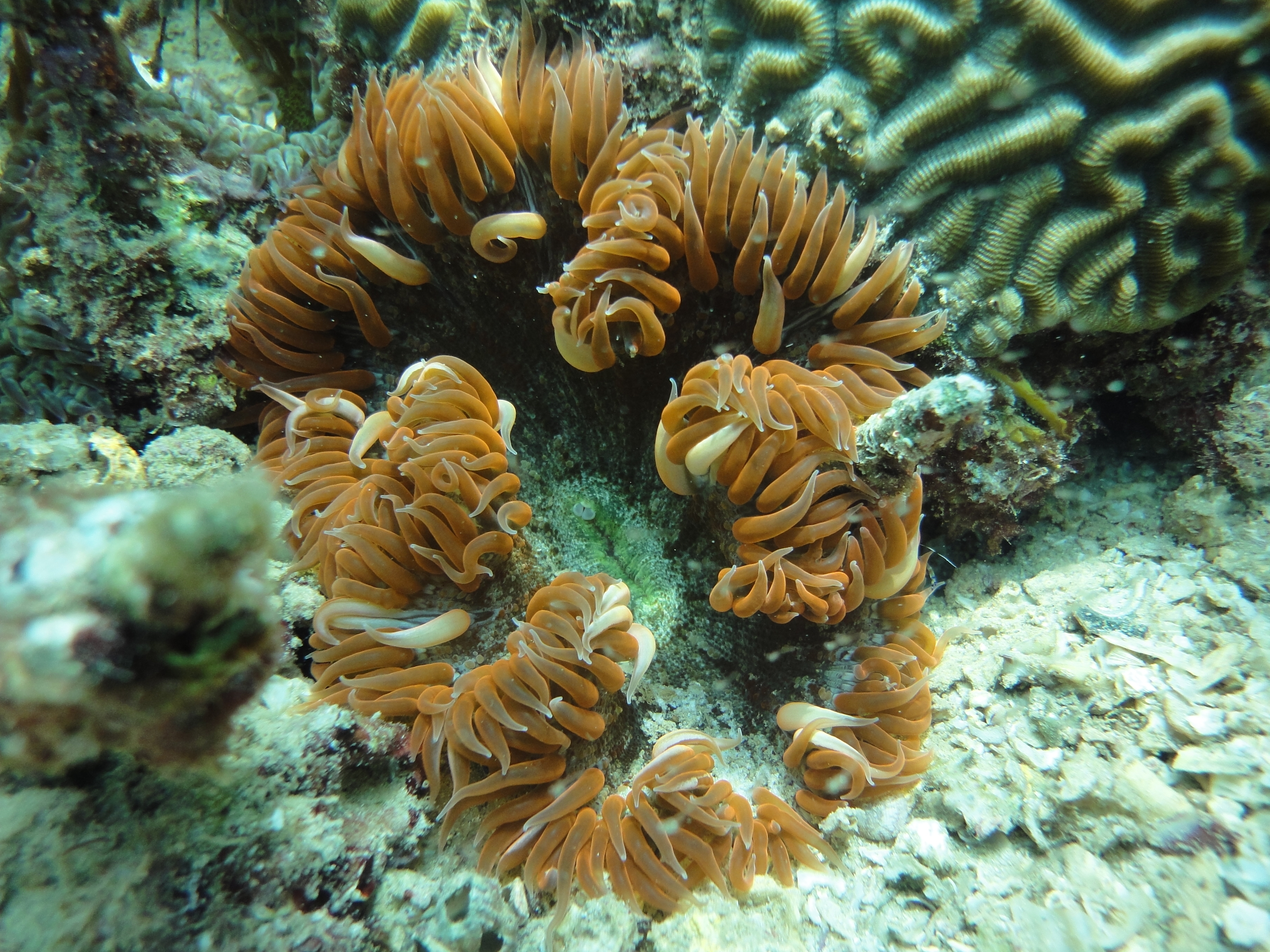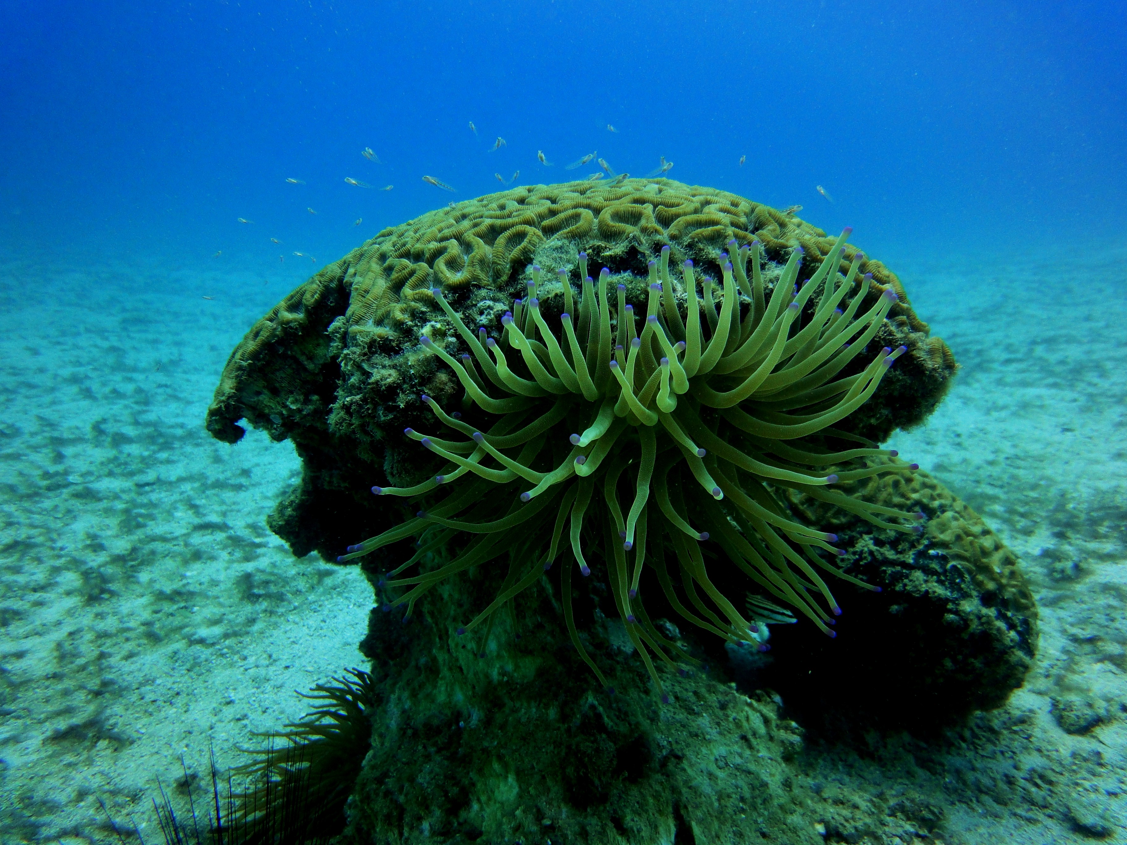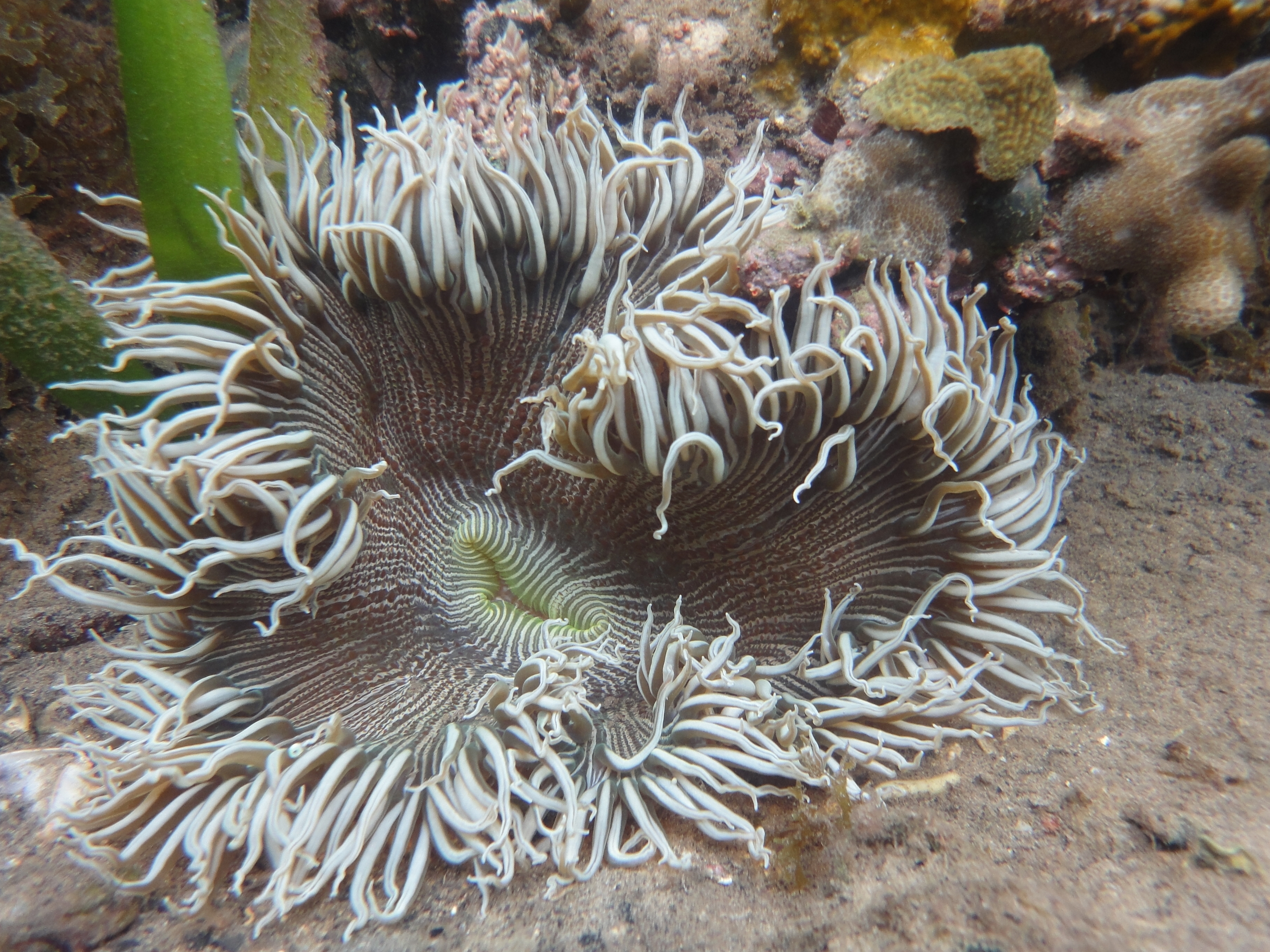 Otro grupo de cnidarios que puede incluir animales con formas poco comunes son los anthozoos (Clase Anthozoa). En éstos, sólo se presenta la fase de pólipo, pudiendo formar grandes colonias como en la mayoría de los corales y zoántidos, o pólipos solitarios como muchas anémonas. En ocasiones, las anémonas nos sorprenden con formas y colores más propios en flores de plantas terrestres, como la anémona de la especie Condylactis gigantea, que se ubica bajo un coral pétreo en la imagen que sigue. Esta especie es la anémona de mayor tamaño en el Caribe, y se encuentra frecuentemente asociada a camarones simbiontes (del género Periclimenes frecuentemente) que a su vez son limpiadores de muchas especies de peces. Se ha demostrado que las anémonas pueden servir como claves visuales para interacciones de limpieza entre peces de arrecifes y camarones (Huebner y Chadwick, 2012).