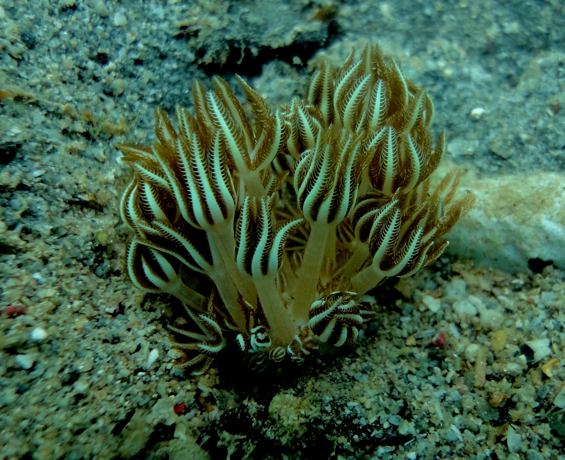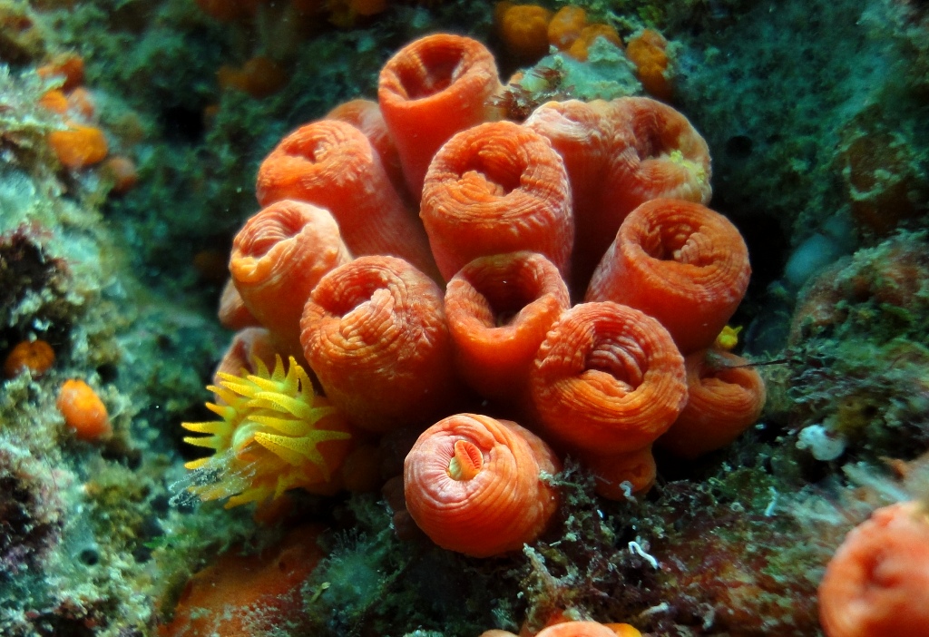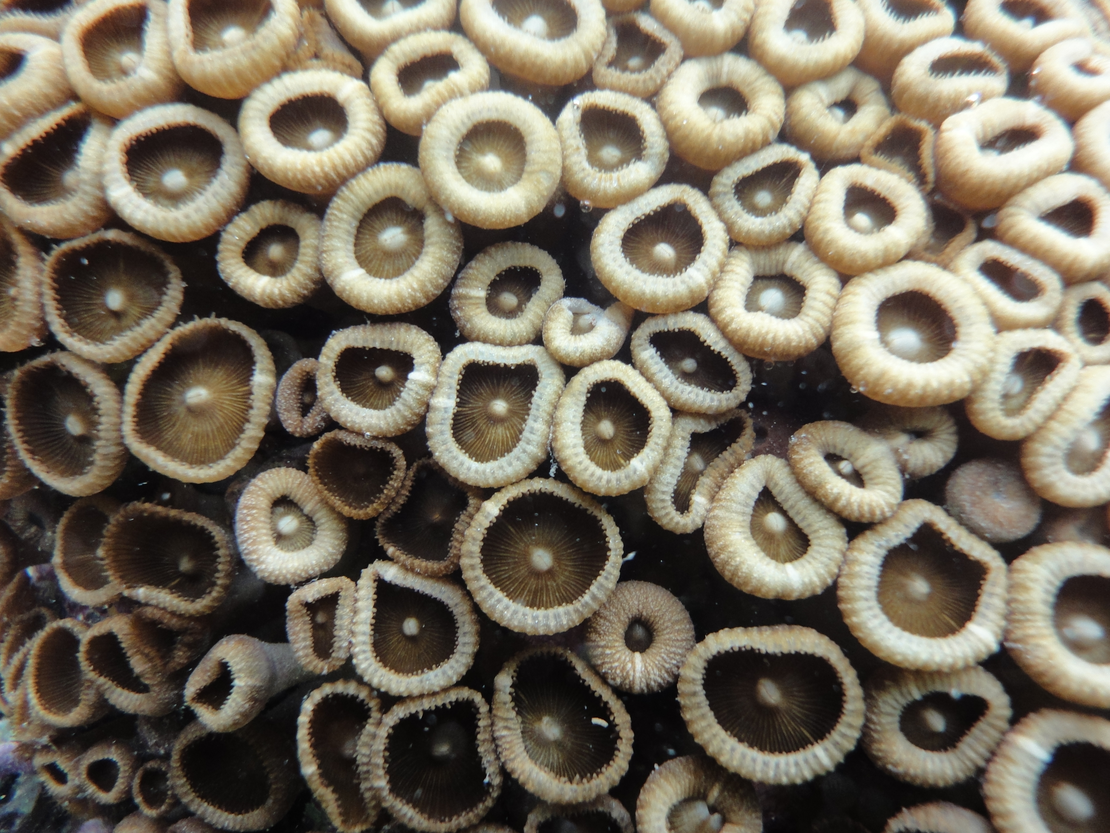 Continuando con el taxón Hexacorallia, vamos a hablar ahora de un miembro del orden Scleractinia. Los escleractinos o corales pétreos, corales duros, poseen un esqueleto de carbonato de calcio que les permite a varias especies formar grandes arrecifes. Son los clásicos corales más comunes. Se les llama escleractinios porque presentan escleritos (un sinónimo de espículas), que no son más que estructuras de protección y sostén constituidas por carbonato de calcio cristalizado en forma de aragonita o calcita. Dentro de este conjunto de animales les traigo estas imágenes de la especie Tubastraea coccinea.