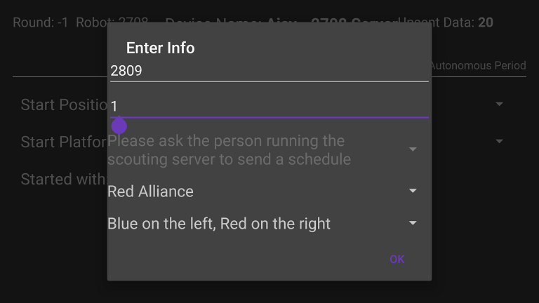 This alert to select a robot is presented at the beginning before scouting. Due to it being an AlertDialog in Android, it was very hard to do anything while in this view, but now I added an options menu that can be displayed in this alert. This allows the user to return back to the menu without restarting the app and view the schedule straight from there.