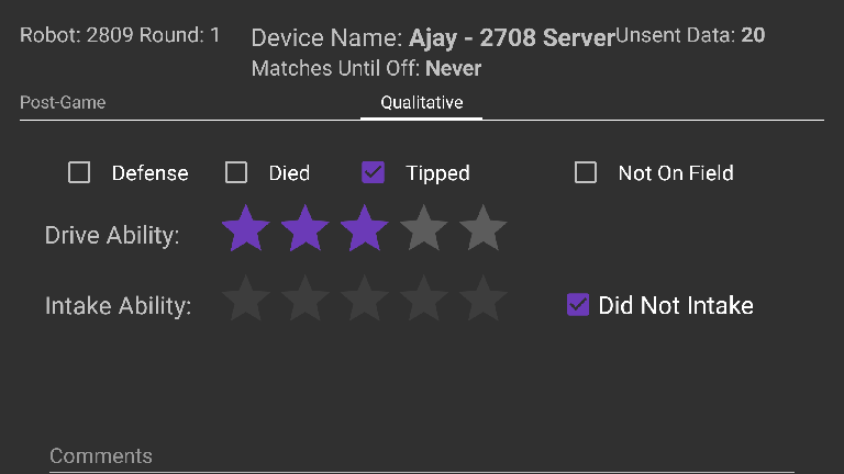 Some users were submitting empty data when a robot no-showed to their match. This is not what we want, we want no data to be submitted for that event. Now, there is a checkbox to specify if they no-showed.