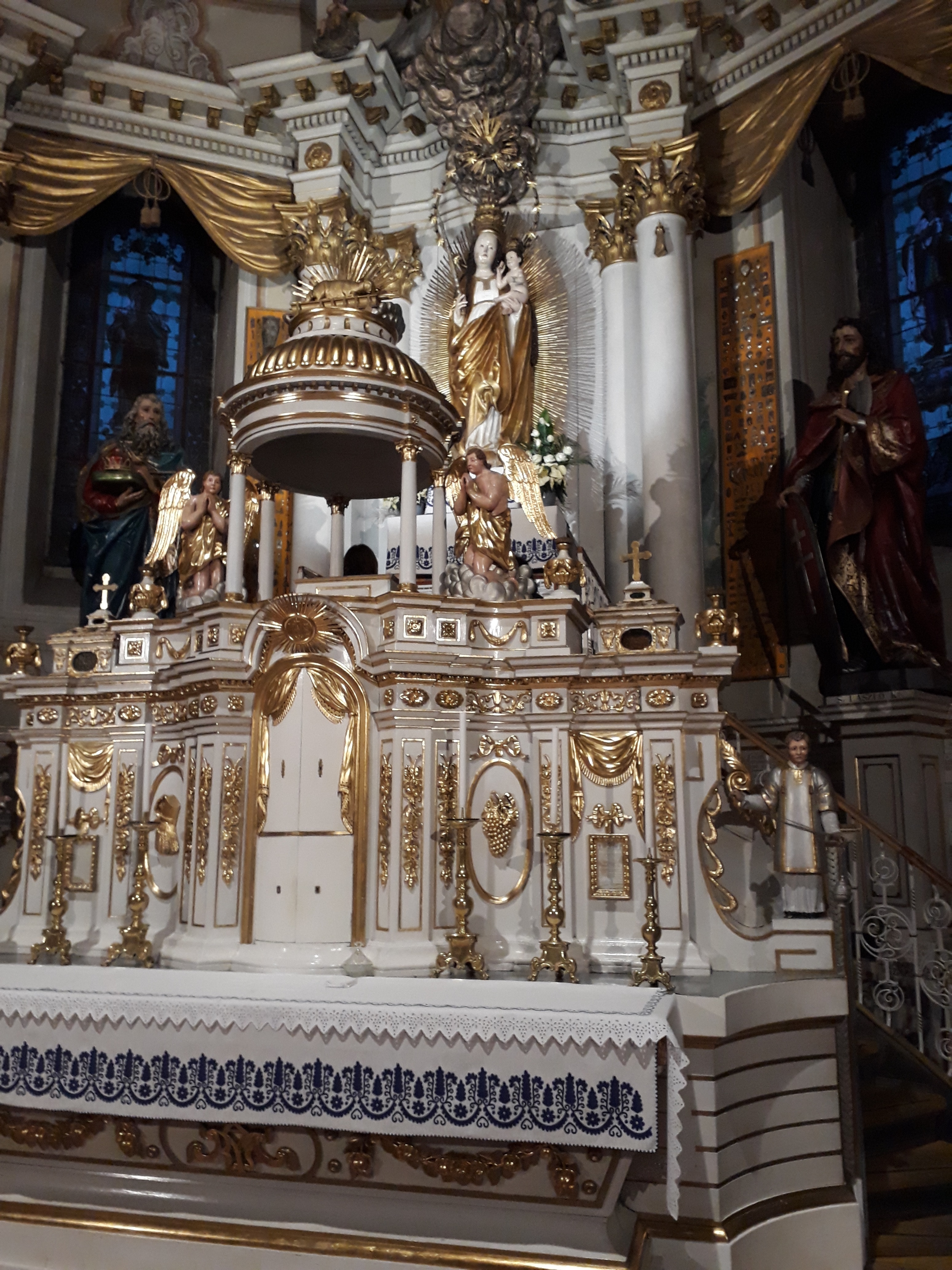 The Holy Virgin with Jesus the child, with gilded wooden crown on her head. The sculpture, made of a linden trunk, painted and gilded, is the largest among the devotional statues known all over the world, having a total height of 227 cm.