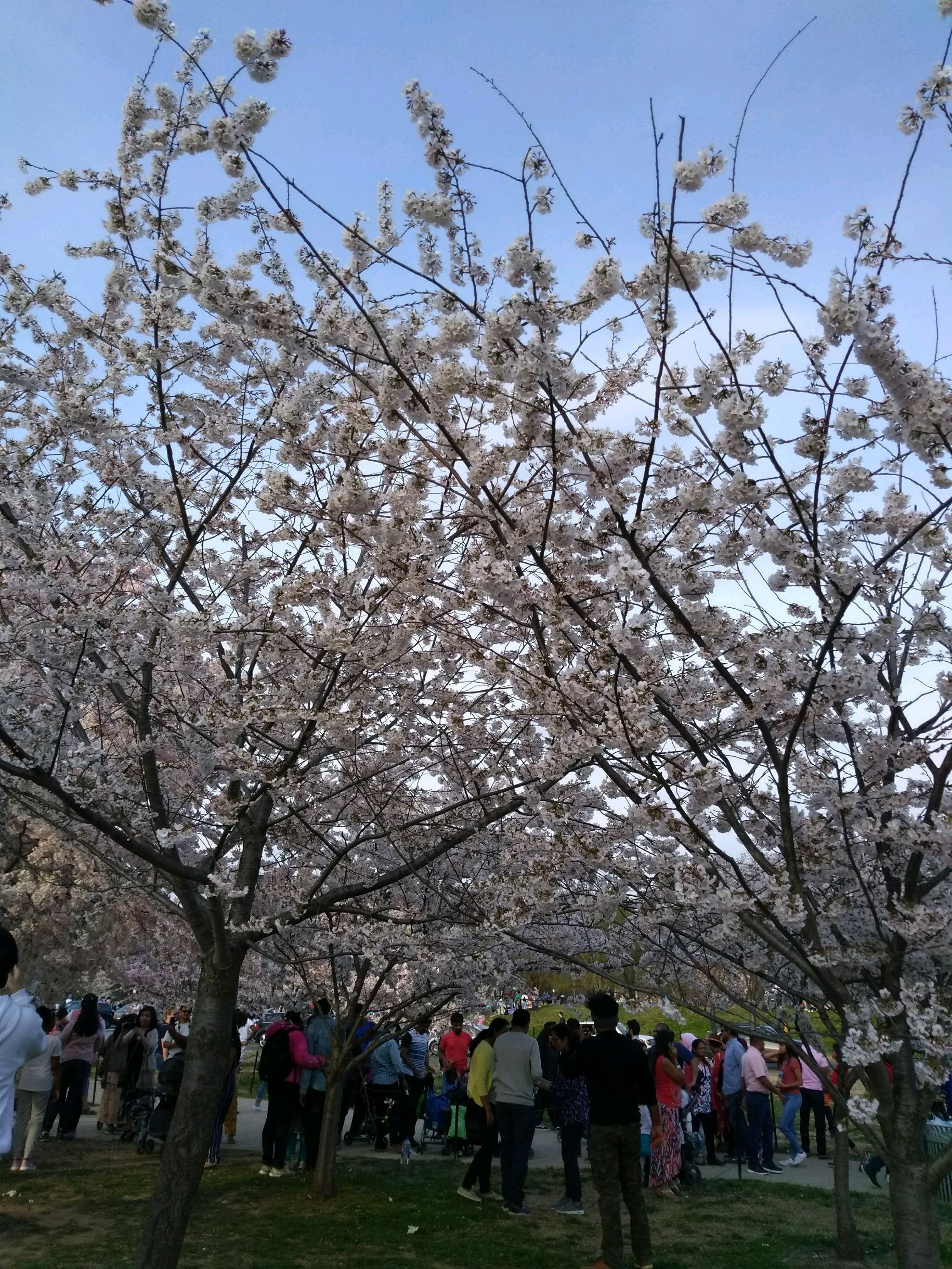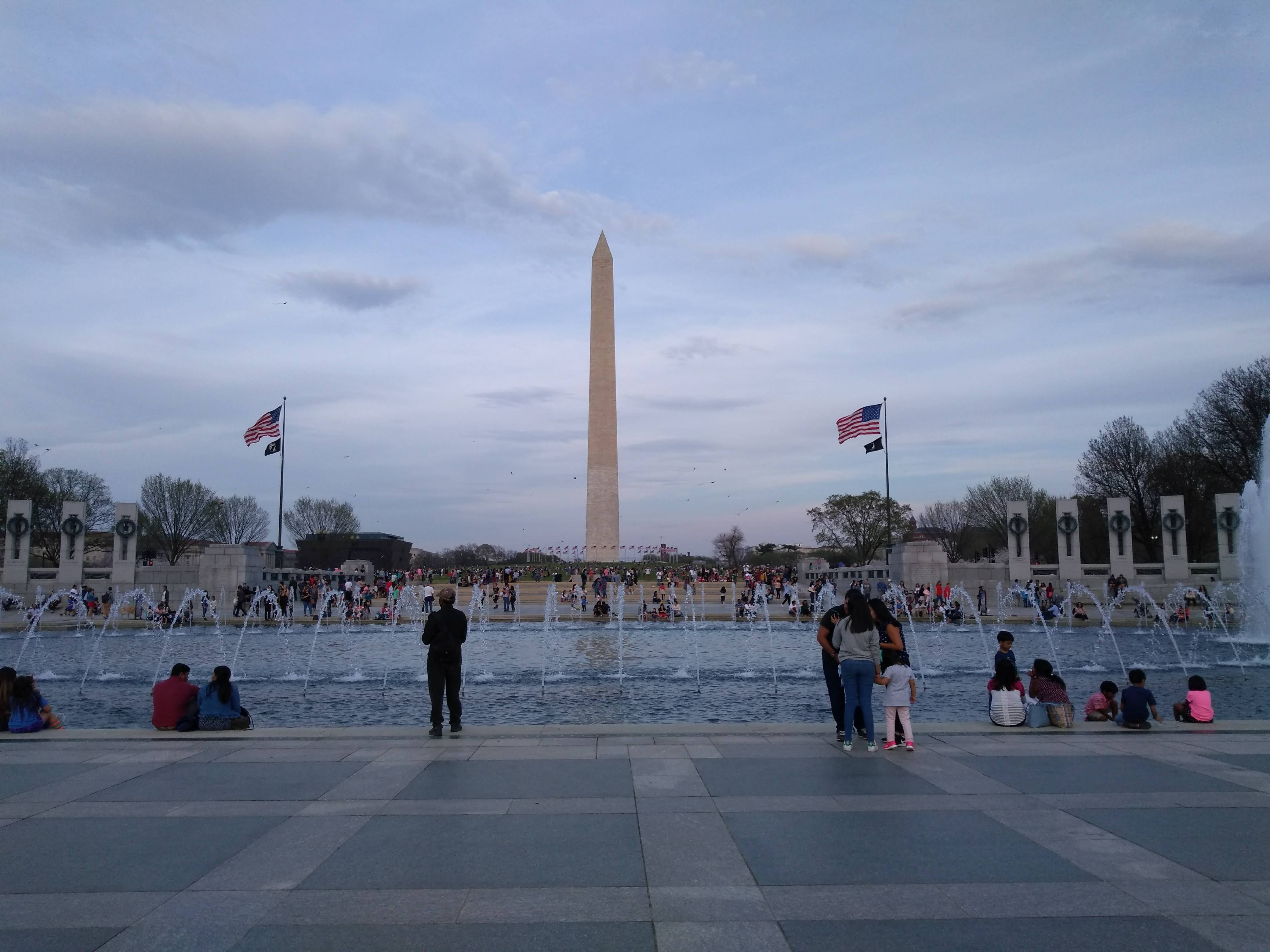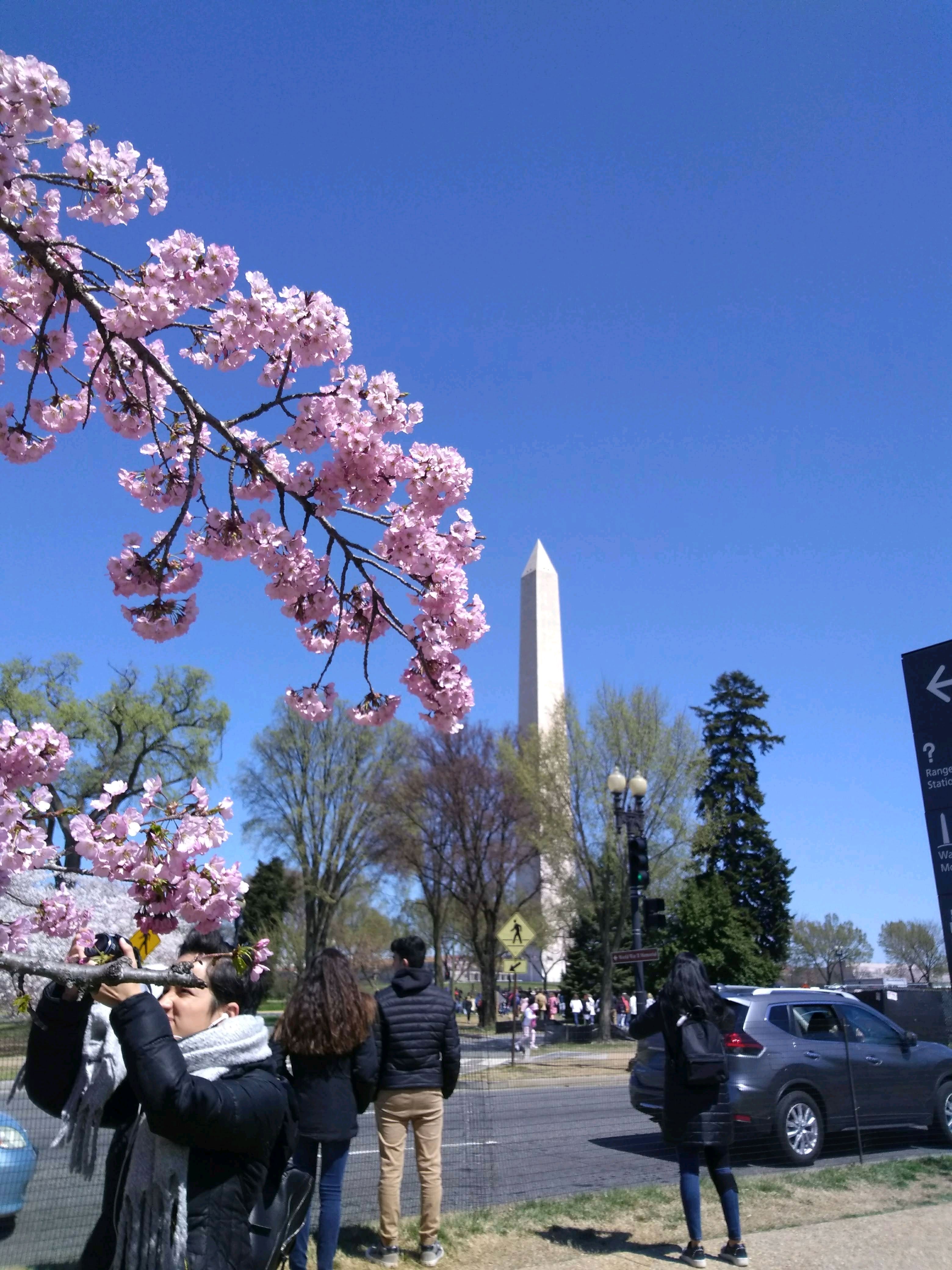 We started walking towards the Washington Monument as the sun was setting and came up to the very beautiful cherry blossoms all around this area. I wish I could have taken better photos, but the crowds taking photos around the trees were like busy bees pollinating the flowers. They were swarming the trees to the point that I couldn't get a single good shot without someone in it. This was the best I could do: