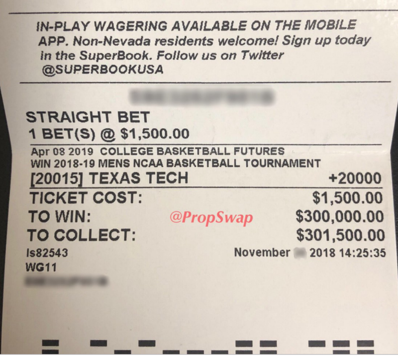 The other day I posted about a bet that was made way back in November by a Savvy bettor who had a hunch about a long shot. This person put $1500 down on 200-1 odd Texas Tech to win the NCAA National Basketball Championship. This was before the season was even in full swing and with a boatload of other teams who experts were predicting to take home the big prize. The ticket pays $300,000 and it was down to only two more wins by the Red Raiders for the ticket to come through. The owner of the ticket had put the ticket up for sale on a ticket exchange site called Proswap. Proswap allows owners of futures tickets to sell the ticket to someone else. This allows them to make some profit on the ticket and put the stress of the outcome on someone else. The potential $300,000 was offered up for a mere $65,000 through the exchange site.