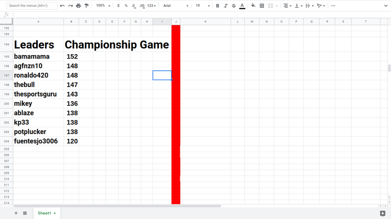 Now, the fight for 2nd and 3rd is going to come down to the tiebreaker. Unfortunately for thesportsguru, Auburn losing knocked him out of contention and down to 5th place. Both agfnzn10 and ronaldo420 are tied for 2nd place and they have the same teams in the final. thebull came up just a single point short of the top 3. The score of tonight's game will determine who takes home the 100 SCR 2nd place prize and who will settle for 3rd and 50 SCR. agfnzn10's tiebreaker score total is 155 while ronaldo420 has 141. The tiebreaker rules were as follows.