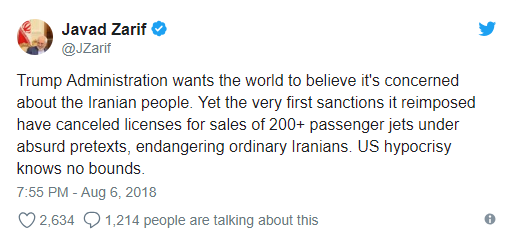 The “Trump Administration wants the world to believe it’s concerned about the Iranian people,” Iranian foreign minister Mohammad Javad Zarif said in a statement posted to Twitter.