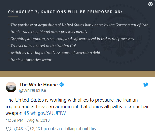 The US sanctions target financial transactions that involve US dollars, Iran’s automotive sector, the purchase of commercial planes and metals including gold.